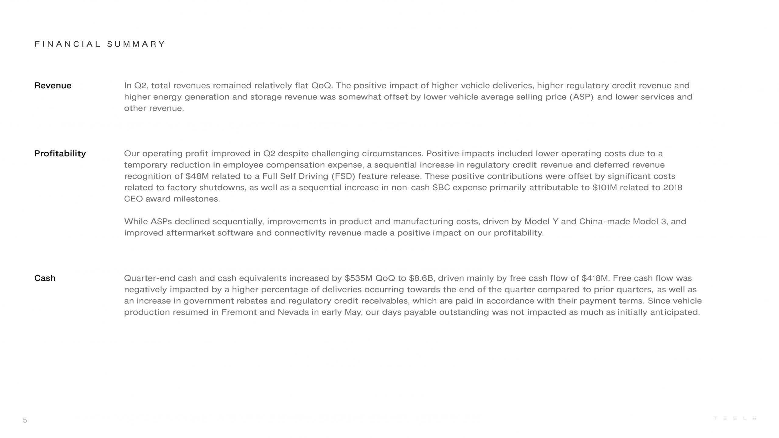 对利润积极的影响因素包括员工激励成本的暂时减少,监管信贷收入的环比提升,FSD功能发布带来4800万美元递延收入的确定。这些积极的影响因素被工厂停工带来的显著成本增加、以及给马斯克的非现金股权激励1.01亿美元所抵消。
