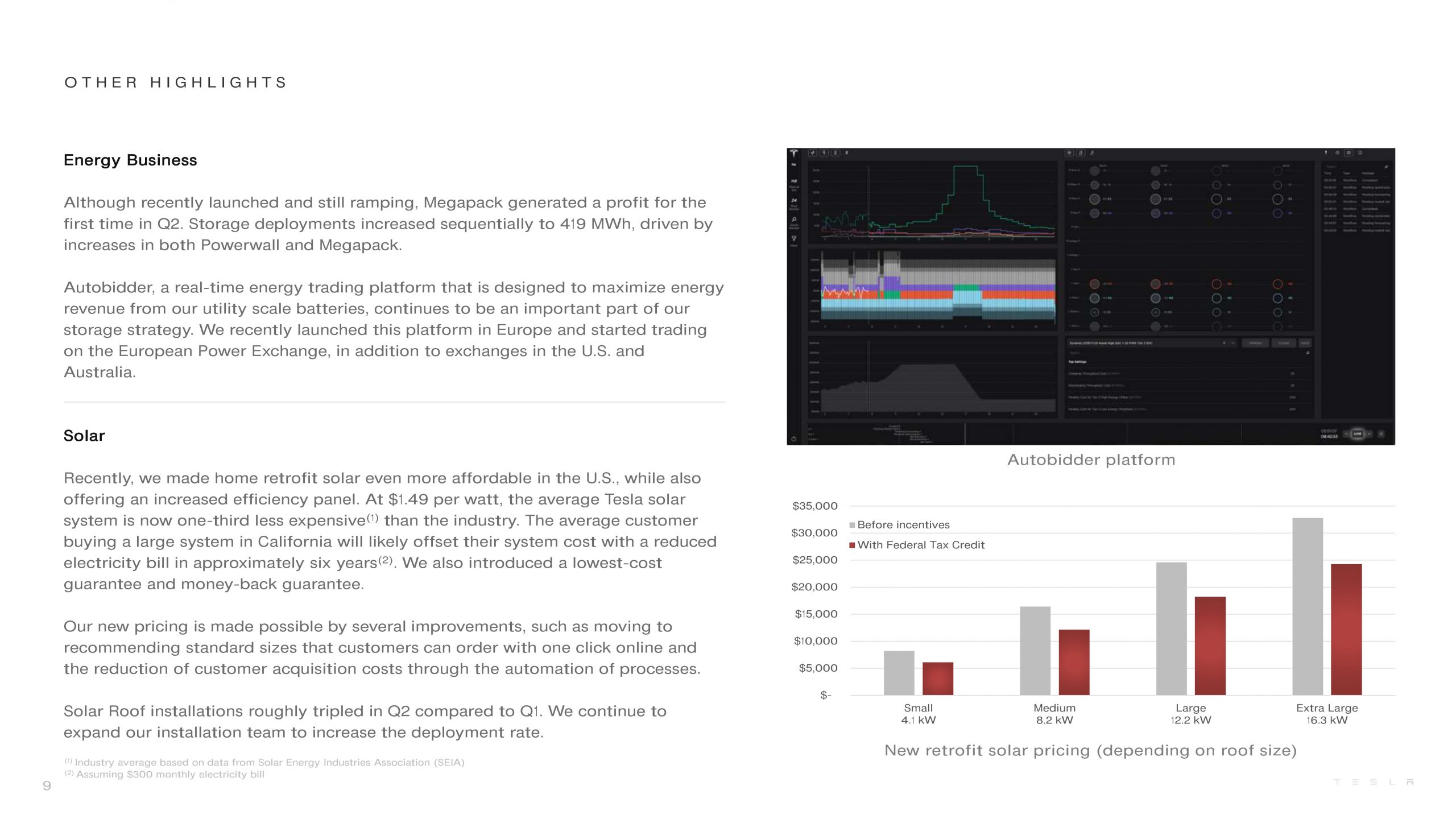 今年第二季度,太阳能屋顶的安装量是第一季度的三倍。特斯拉继续扩展安装团队以提高部署率。
