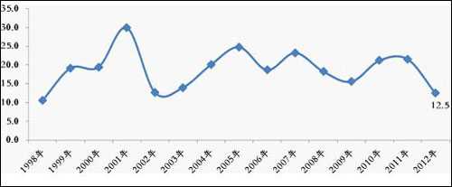 根据中华全国商业信息中心的统计,2012年全国重点大型零售企业服装零售额同比增长12.5%,较上年降低了9.1个百分点,增速为1999年以来的最低值。其中,上半年零售额同比增长11.1%,下半年增速有所好转,达到13.9%。