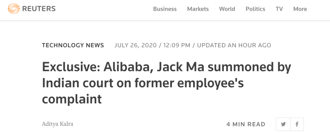 落款日期为7月20日的法庭文件显示,阿里巴巴旗下UC Web前雇员普什潘德拉·辛格·帕玛(Pushpandra Singh Parmar)称自己因反对公司应用程序中的虚假新闻而被错误解雇。而印度首都新德里卫星城古鲁格拉姆一家地方法院民事法官索尼娅·谢克德(Sonia Sheokand)已向阿里巴巴、马云等十几位人士或公司发出传票,要求他们在7月29日出庭或通过律师出庭。