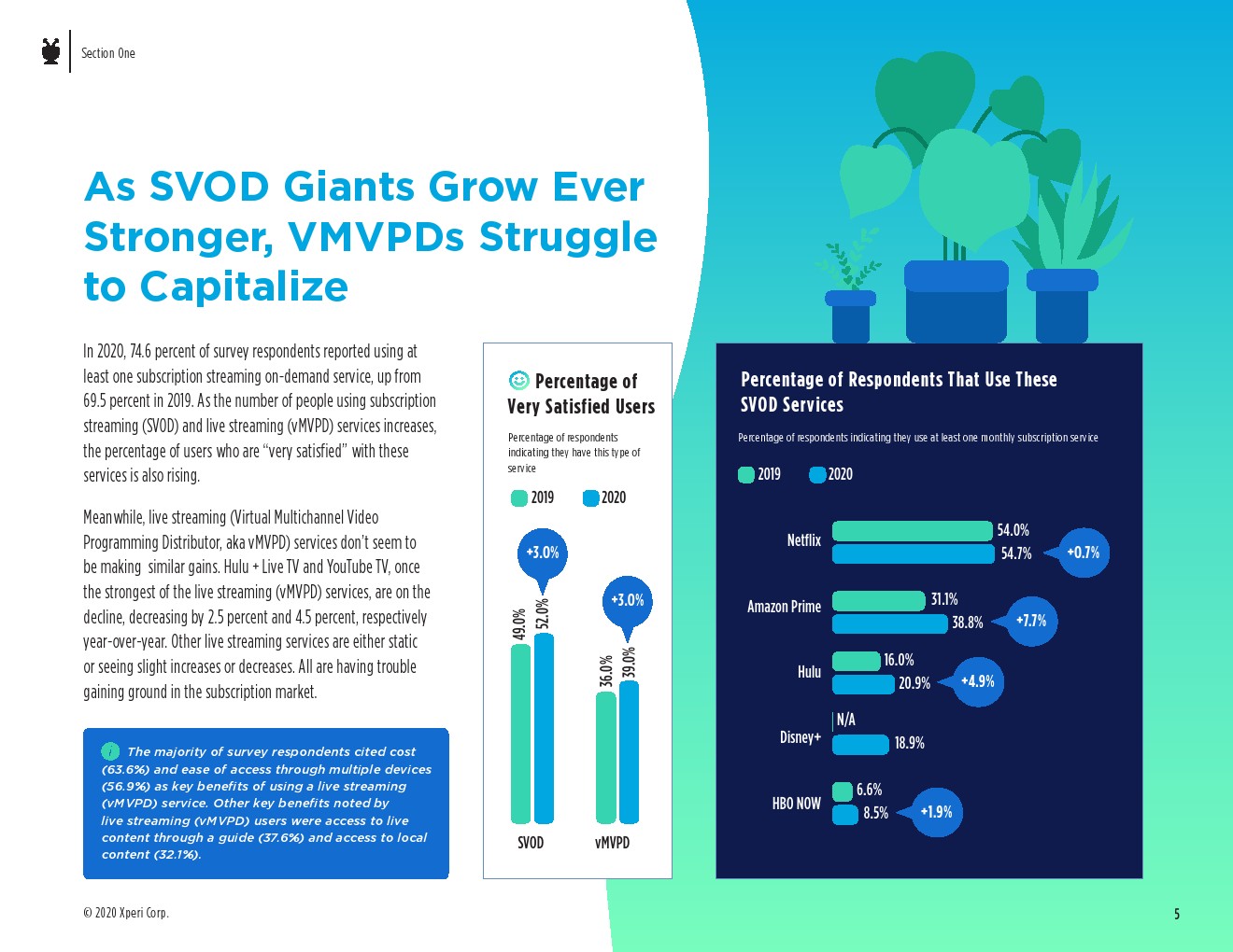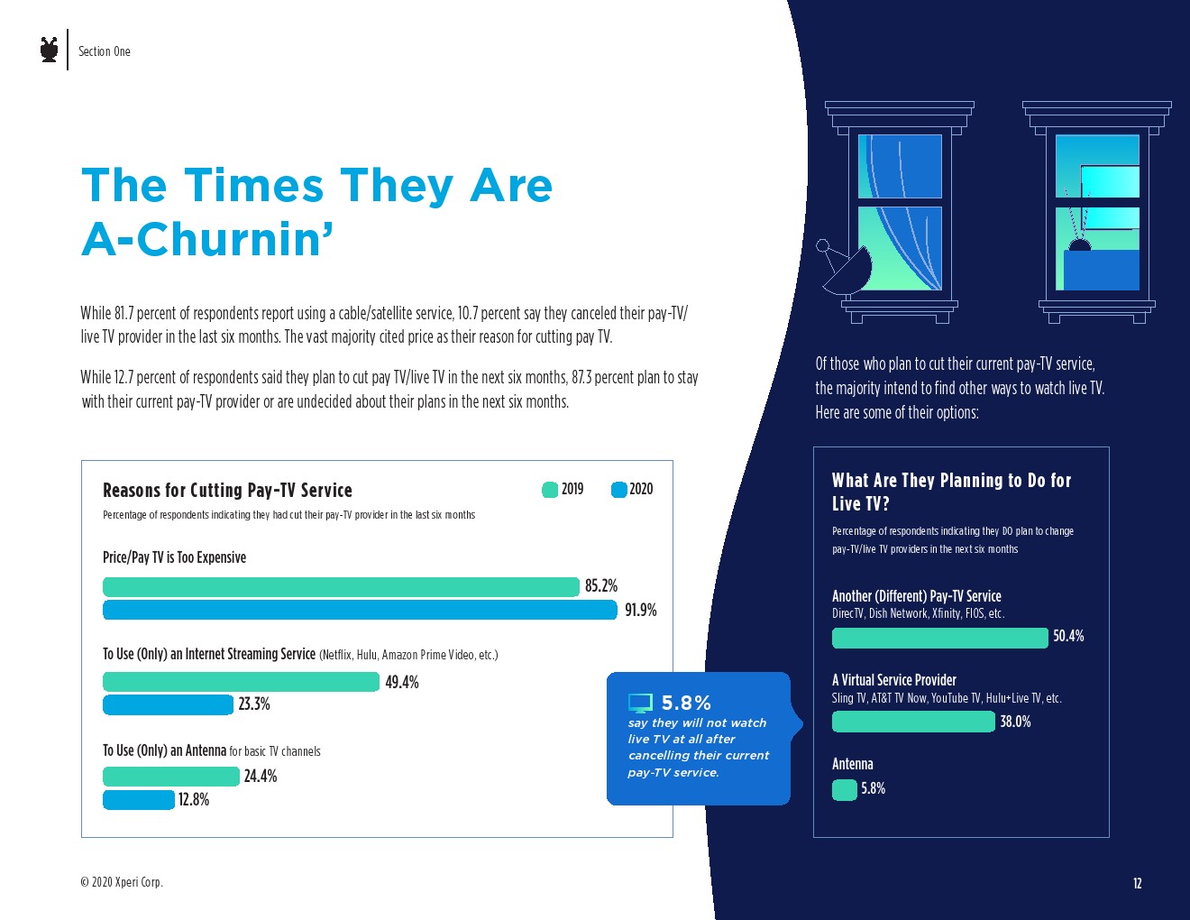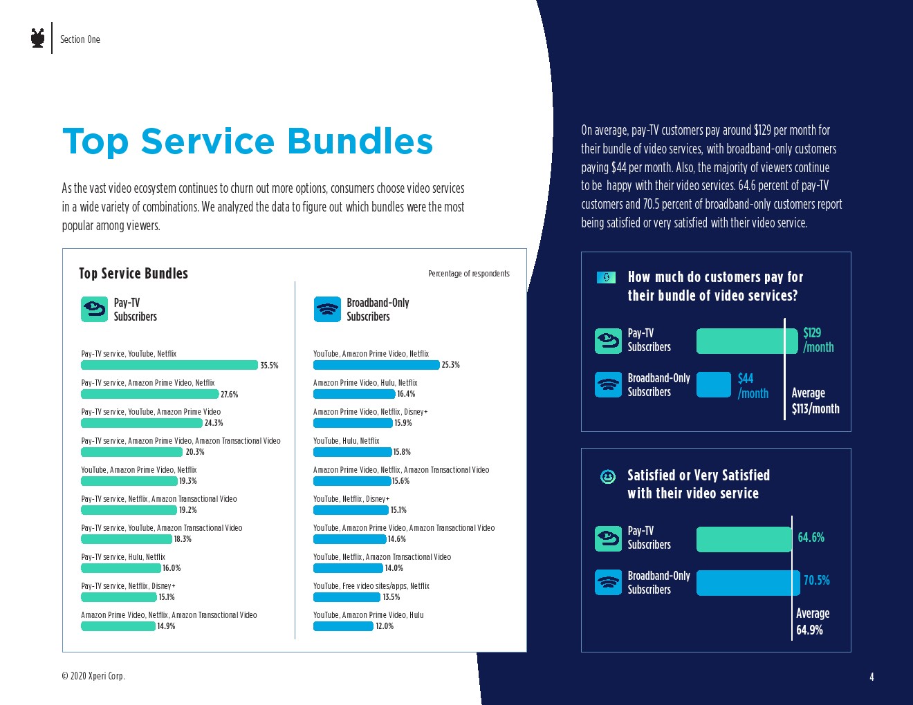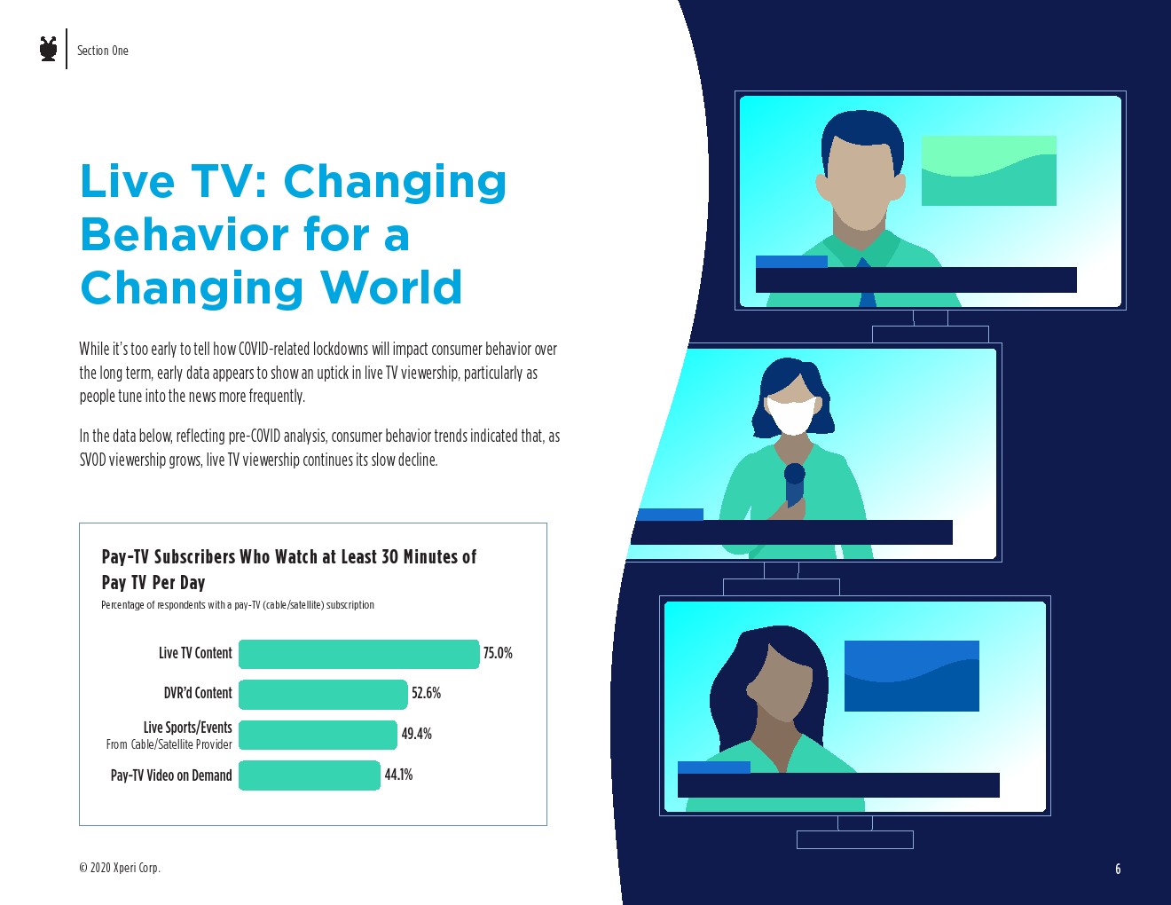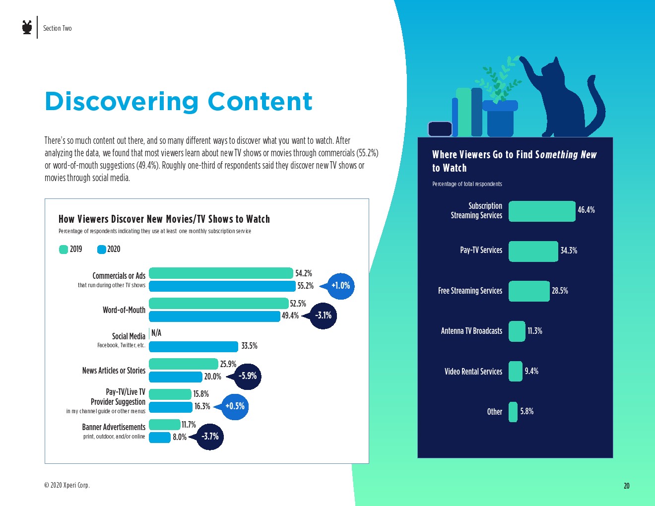 当谈到了解下一步要看什么时,大多数接受调查的消费者(所有人都至少有一项月度订阅服务)通过在其他电视节目期间播放的商业广告发现内容(55%)。2020年第一季度,报告通过口碑找到新内容的人数略少(49%),而2019年这一比例为52.5%。社交媒体是下一个最常见的发现内容的方式(33.5%);其次是通过新闻报道发现内容(1/5),尽管后者的数字比去年有所下降。