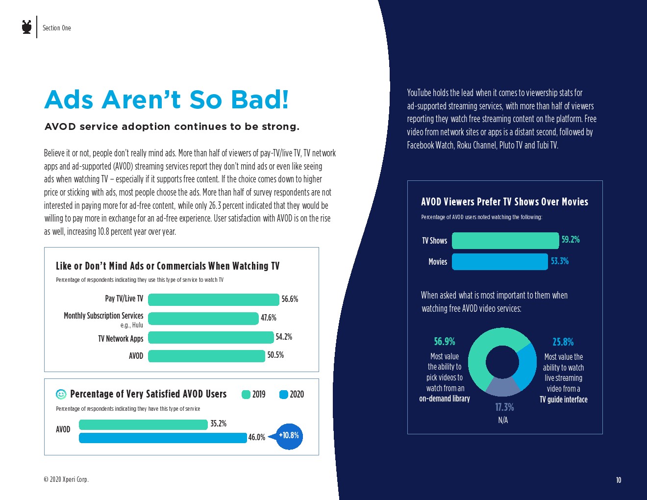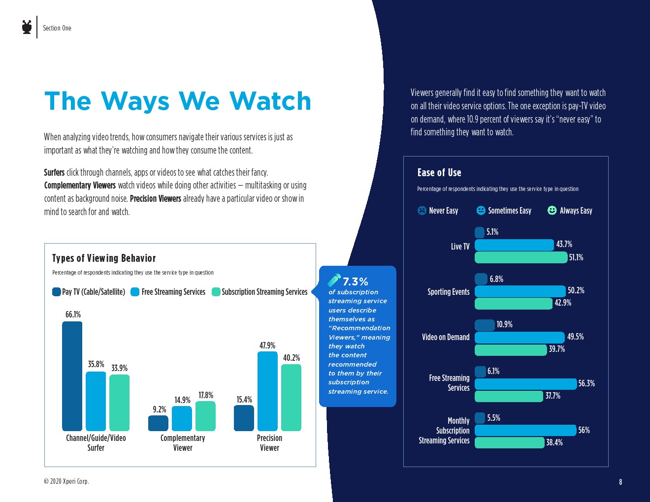 对于广告主来说,观看行为的改变可能会让他们的广告策略更有吸引力。那些看付费电视的人更有可能将自己描述为频道冲浪者(66.1%),而不是在一心多用时看电视作为补充活动(9.2%),或者是在脑海中已经有特定视频或节目的“精确观众”(15.4%)。对于那些使用免费流媒体服务的人来说,情况截然不同。大约1/3的受访者(35.8%)是频道冲浪者;相比之下,14.9%的受访者是免费观众;47.9%的受访者是精确观众。