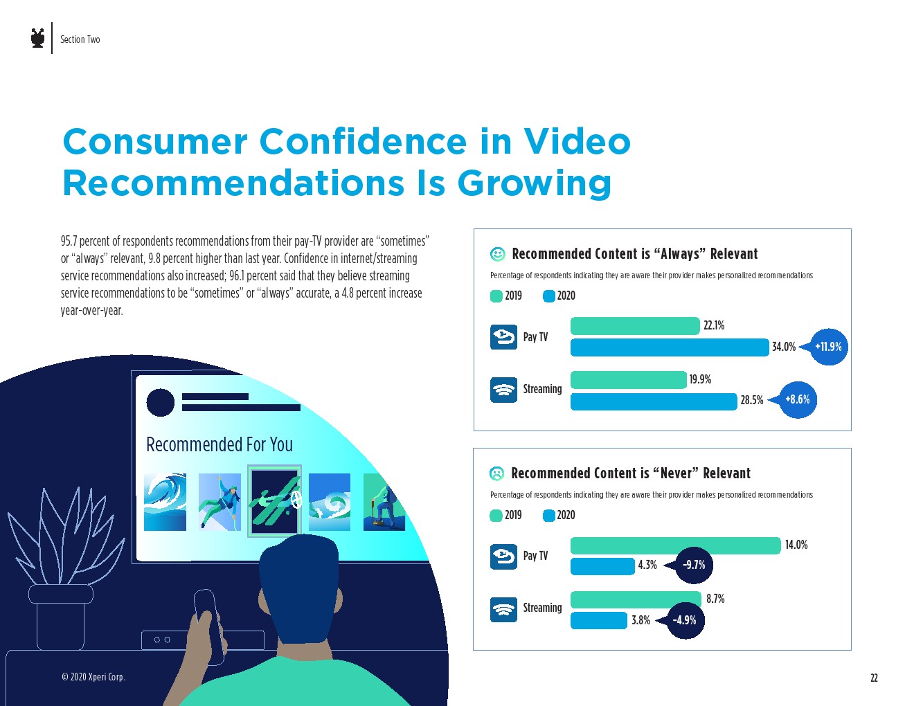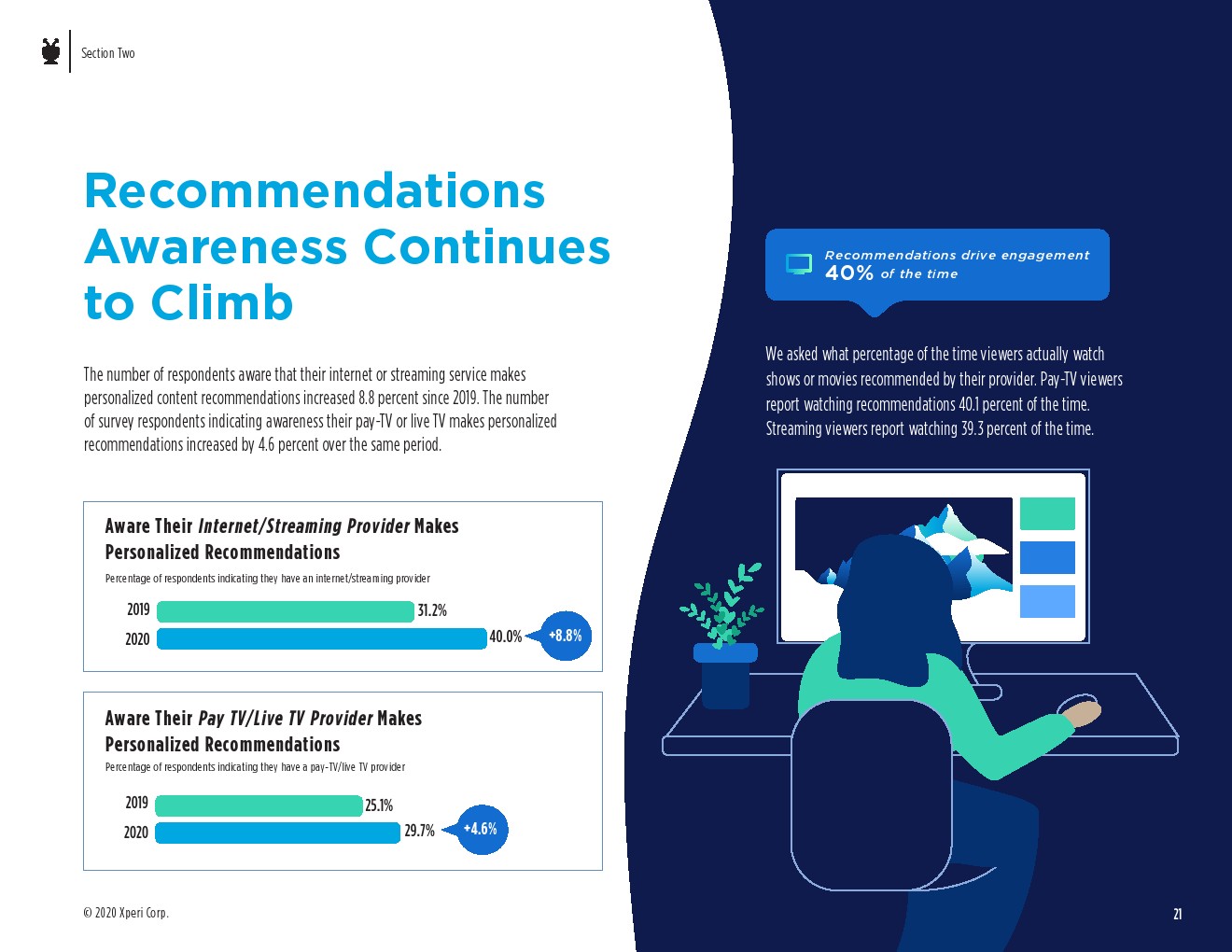 通过付费电视或直播电视提供商的建议发现新内容的观众比例保持相当稳定,约为1/6。尽管不是每个人都利用这些推荐发现新内容,但观众越来越了解它们。3/10的受访者意识到他们的付费电视或直播电视提供商会提供个性化的推荐,而去年这一比例为1/4。