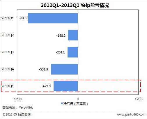 从盈亏情况来看,2013年第一季度Yelp继续保持亏损状态,自2012年初上市以来连续五个季度亏损。从亏损幅度看,2013年第一季度Yelp亏损479.9万美元,和2012年同期的983.3万美元亏损相比明显收窄,和2012第四季度的531.9万美元相比也有一定幅度的改善。品途咨询发现,Yelp的销售和市场费用率、行政管理费用率这两项有一定幅度的下降是其营收改善的主要原因。2013年第一季度,Yelp的销售和市场费用率为61.1%,2012年同期为62.3%;而2013年第一季度Yelp的行政管理费用率为19.0%,和2012年第一季度的39.2%相比有明显的下降。