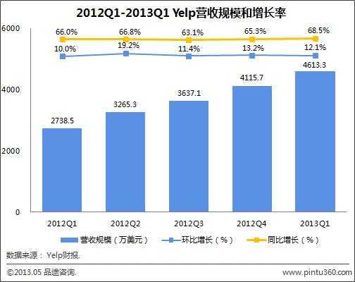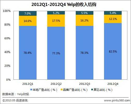 2013年第一季度,Yelp实现营收4613.3万美元,和去年同期相比增长68.5%,和2012第四季度环比增长12.1%,同比和环比都继续保持快速增长态势。品途咨询发现,Yelp的营收增长驱动力一是来源于其地域扩张,2012年Yelp全年新增了26个市场,特别是2012年10月通过收购点评网站Qype使Yelp在欧洲地区的市场地位更为稳固,这些新增市场经过前期的发展和整合到现在已经能为Yelp营收增长贡献力量。Yelp营收快速增长的另外一个驱动力来源于其继续深挖本地市场潜力,受益于本地商户营销需要地快速增加,Yelp的本地广告收入增幅加快,占整体营收的比重呈增大趋势。到2012年第四季度时,本地广告收入占整体营收的比重已经达到82.5%,2013年这一占比将继续增大。