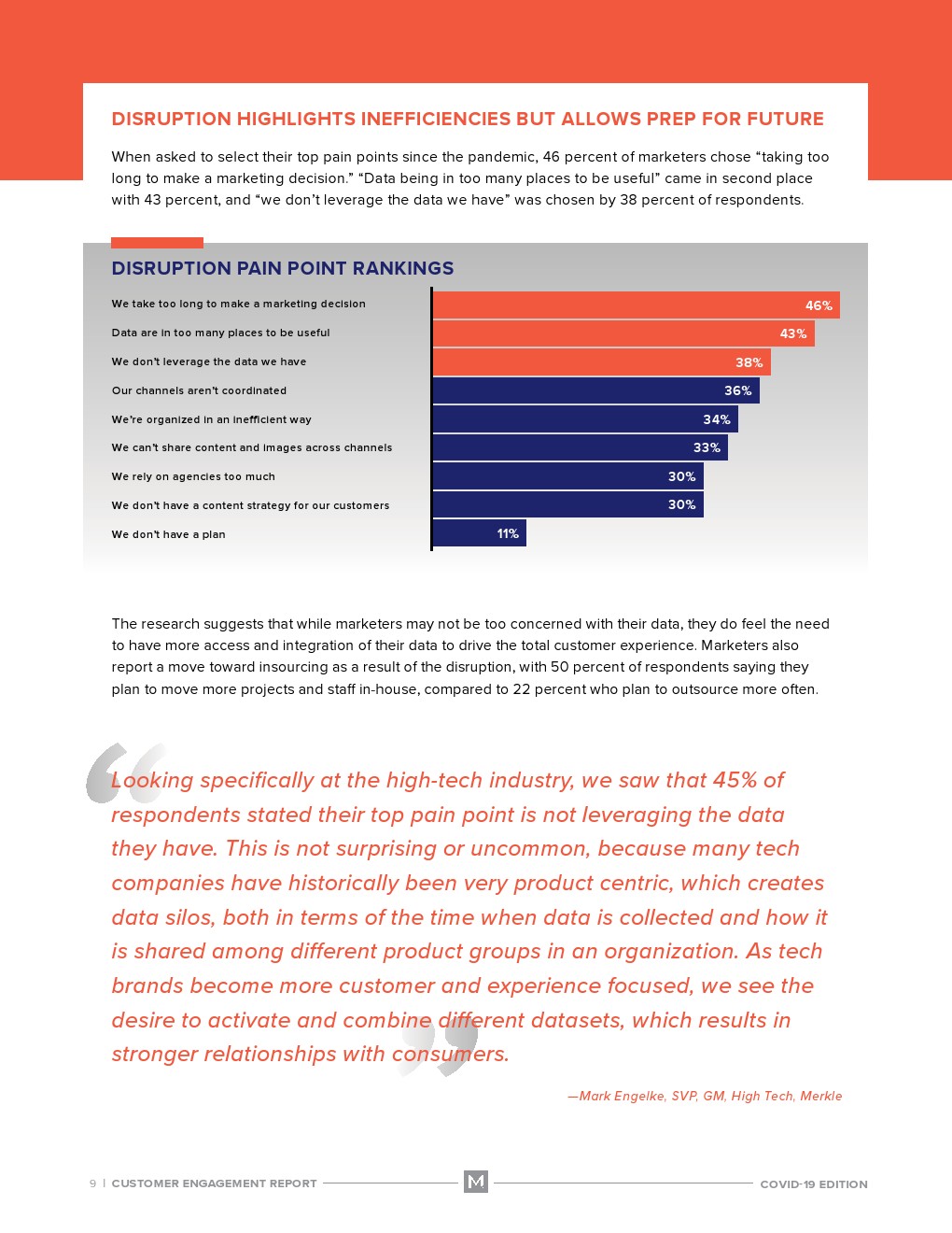 46%的受访者表示,花太长时间做营销决定被证明是一种干扰。超过4/10的受访者(43%)表示,太多数据没有用。另有38%的受访者声称他们没有利用现有数据。