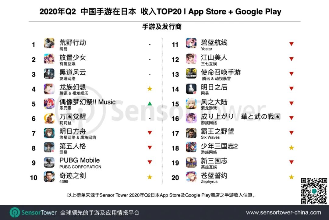由腾讯和祖龙娱乐联合推出的MMORPG手游《龙族幻想》是榜单中唯一的新游,入围畅销榜Top20的中国手游因而增至5款,包括:战术竞技手游《荒野行动》,三国题材美少女RPG手游《放置少女》,黑帮题材SLG手游《黑道风云》,以及音乐手游《偶像梦幻祭!! Music》。中国厂商凭借差异化的玩法和题材,逐步挺进日本头部市场。