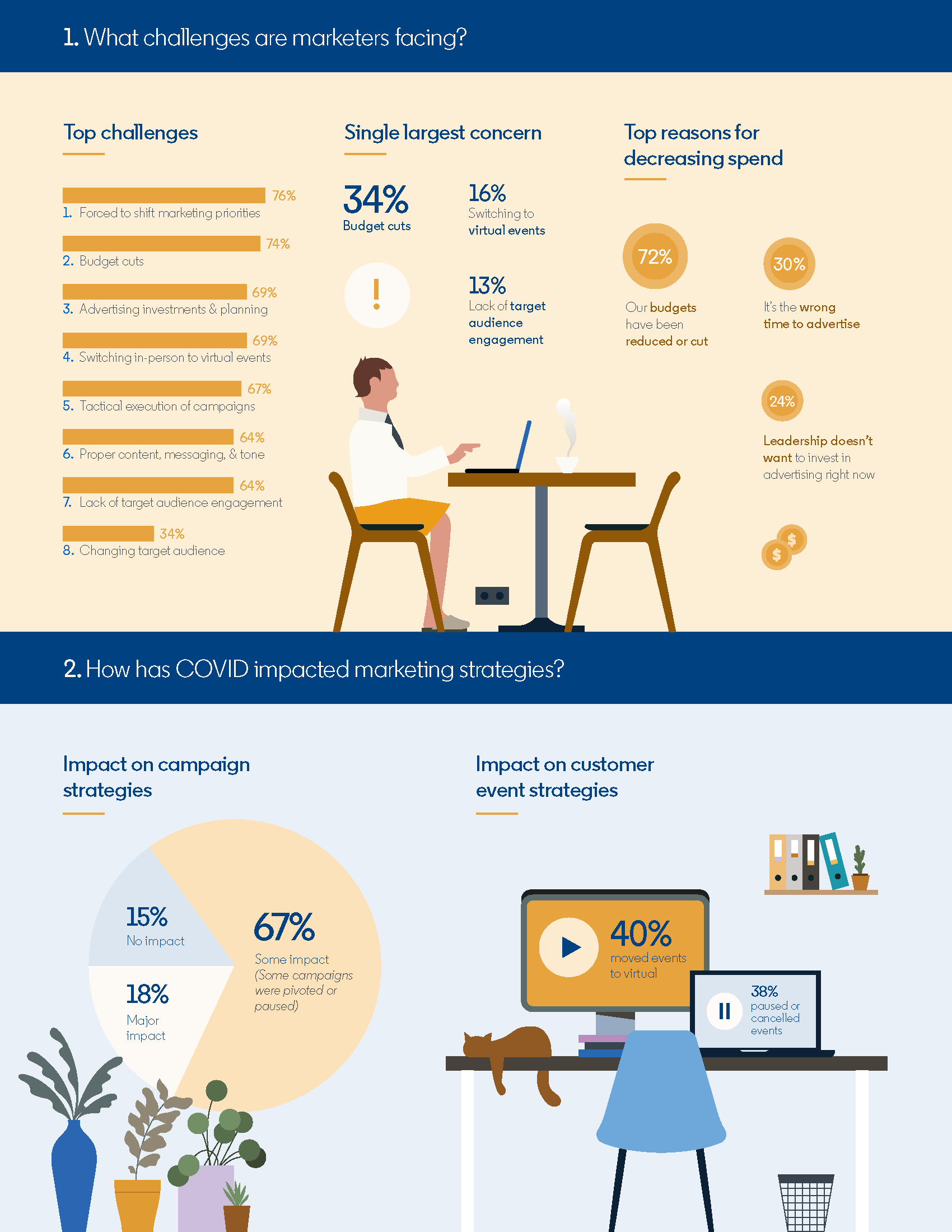 在调查中,42%的受访者认为削减预算是一项“重大挑战”,超过了任何其他回答,74%的受访者表示削减在某种程度上构成了挑战。第二高的回应是将面对面活动转换为虚拟活动(34%),并被迫改变营销重点(31%)。34%的营销人员表示,未来三个月他们最担心的是预算削减,其次是转向虚拟活动(16%)和目标受众缺乏参与度(13%)。