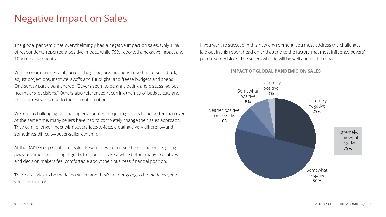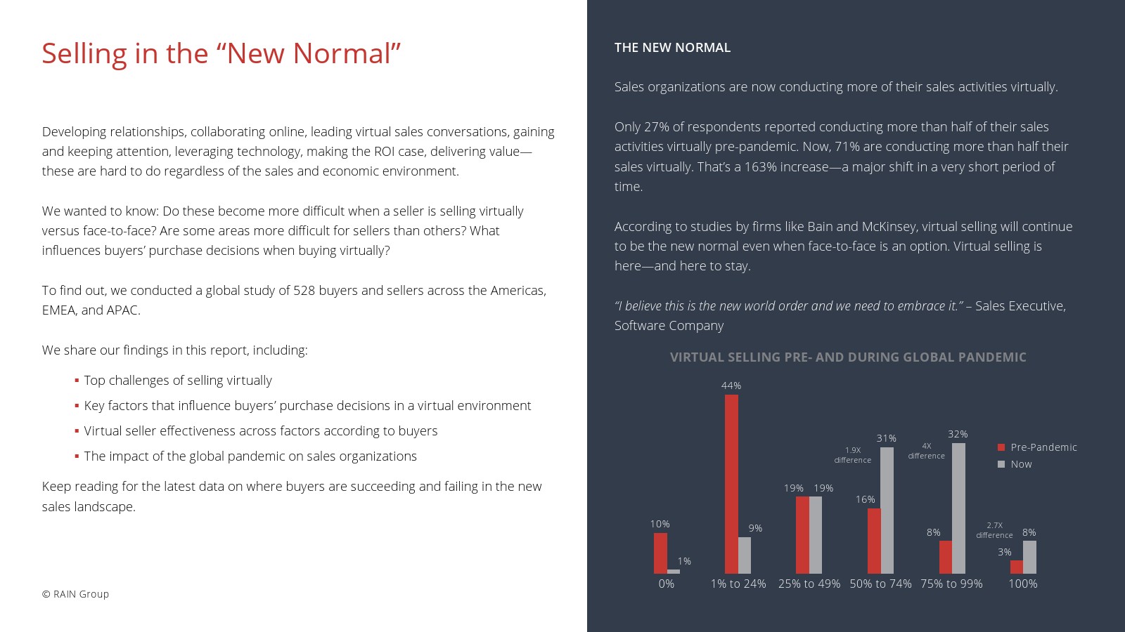 根据RAIN集团的一份新报告,新冠肺炎迫使许多B2B公司改变了经营方式。27%的B2B卖家虚拟了大部分销售活动。截至2020年5月,71%的受访者表示,至少有一半的销售额是通过虚拟方式完成的。