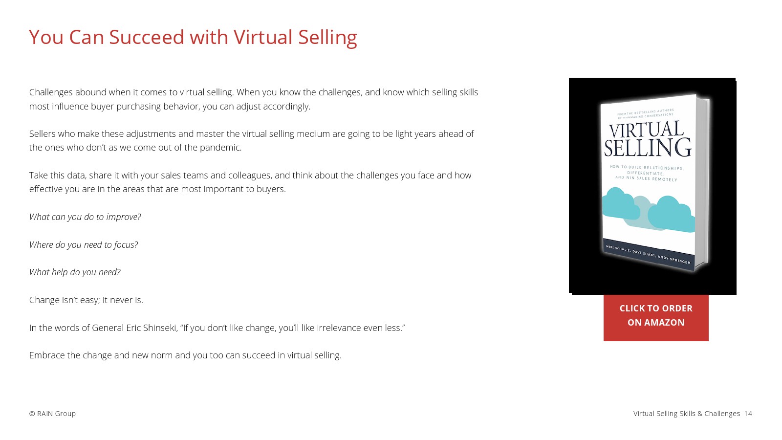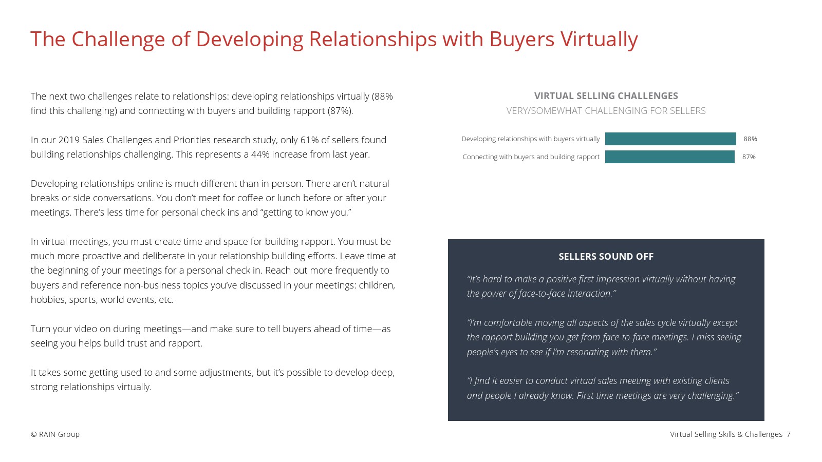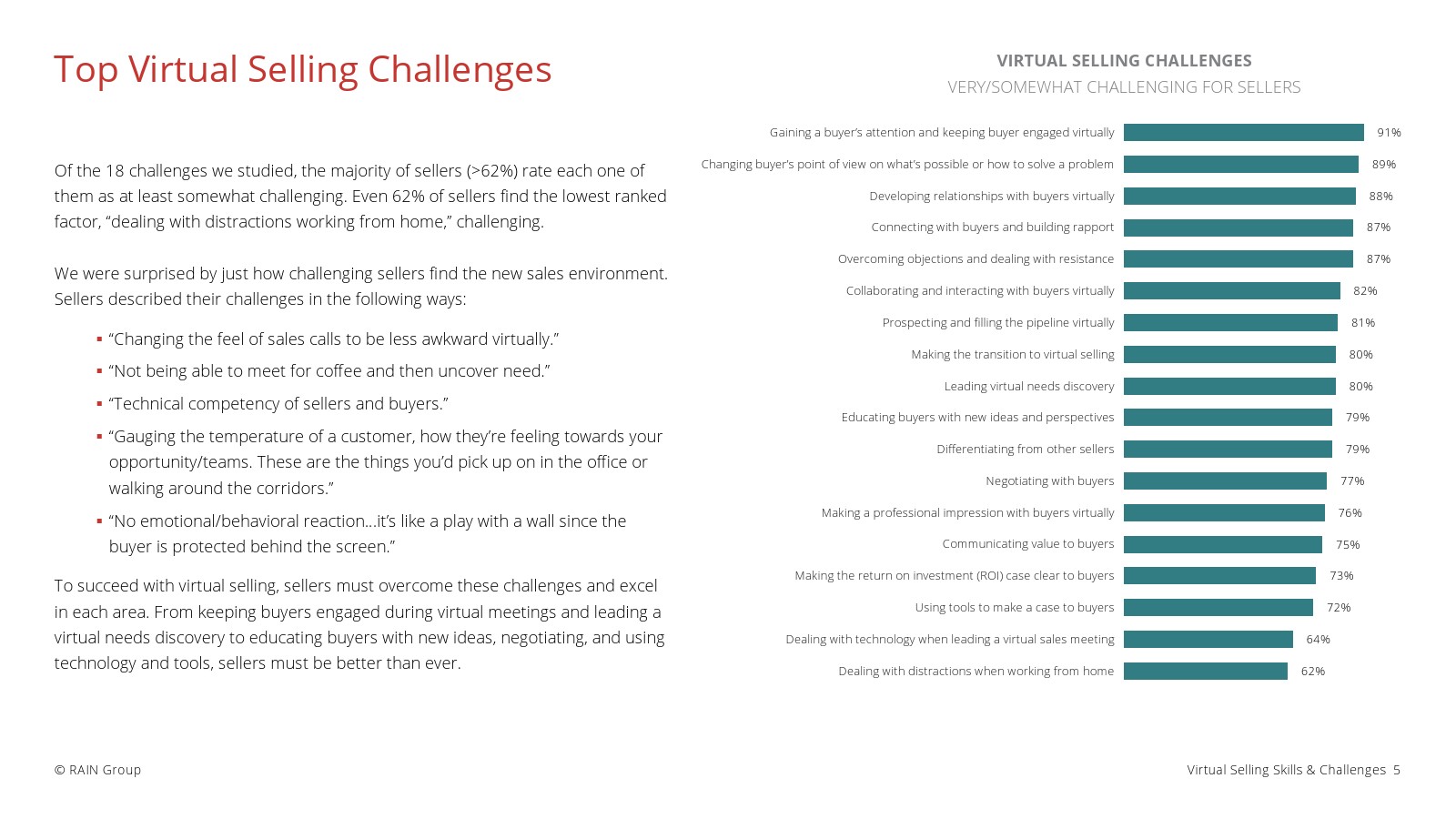 尽管虚拟销售最大的挑战是吸引买家的注意力并保持他们的参与度(91%),但改变买家的观点(89%),虚拟发展与买家的关系(88%),以及与买家建立融洽关系(87%)。