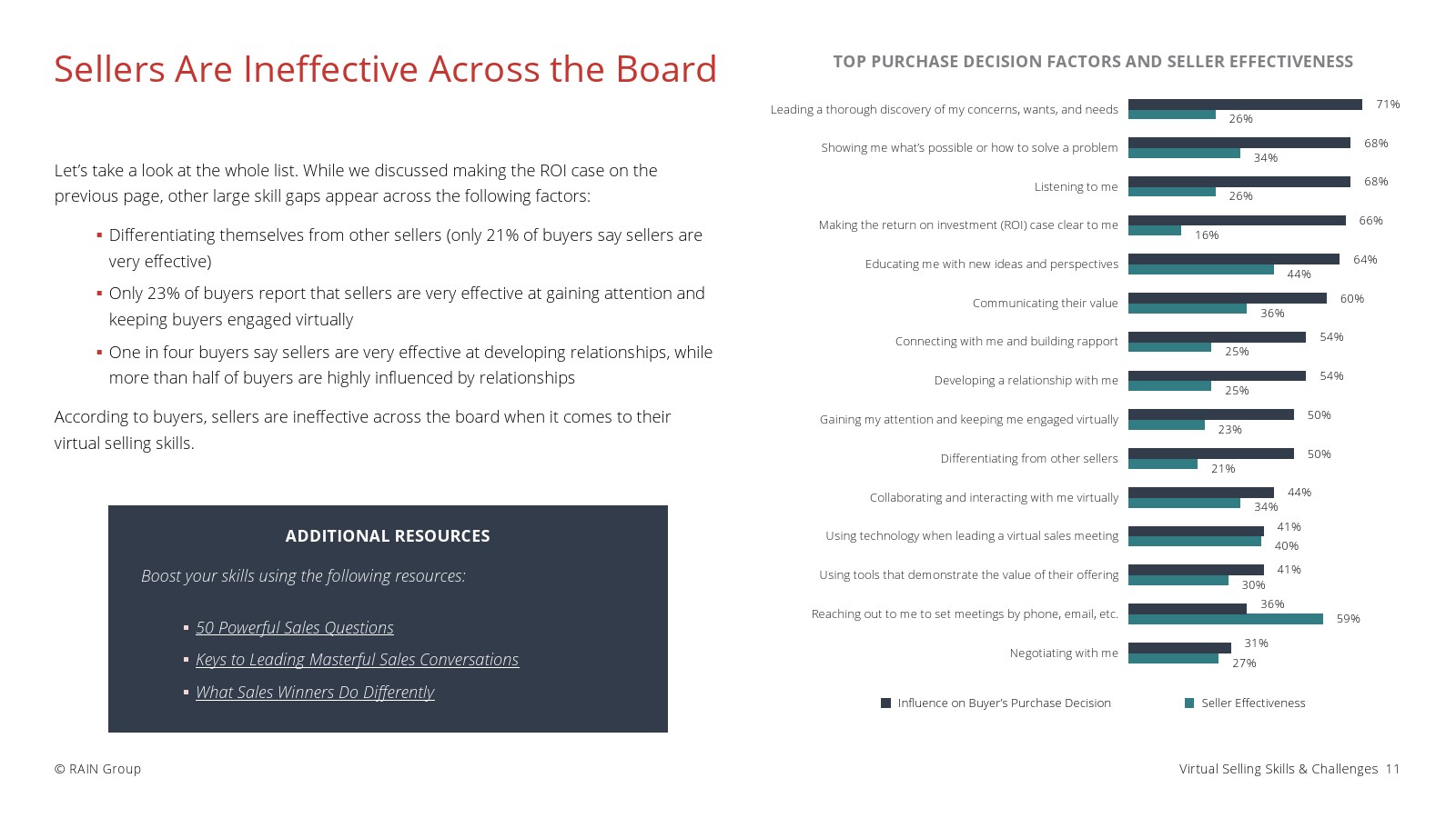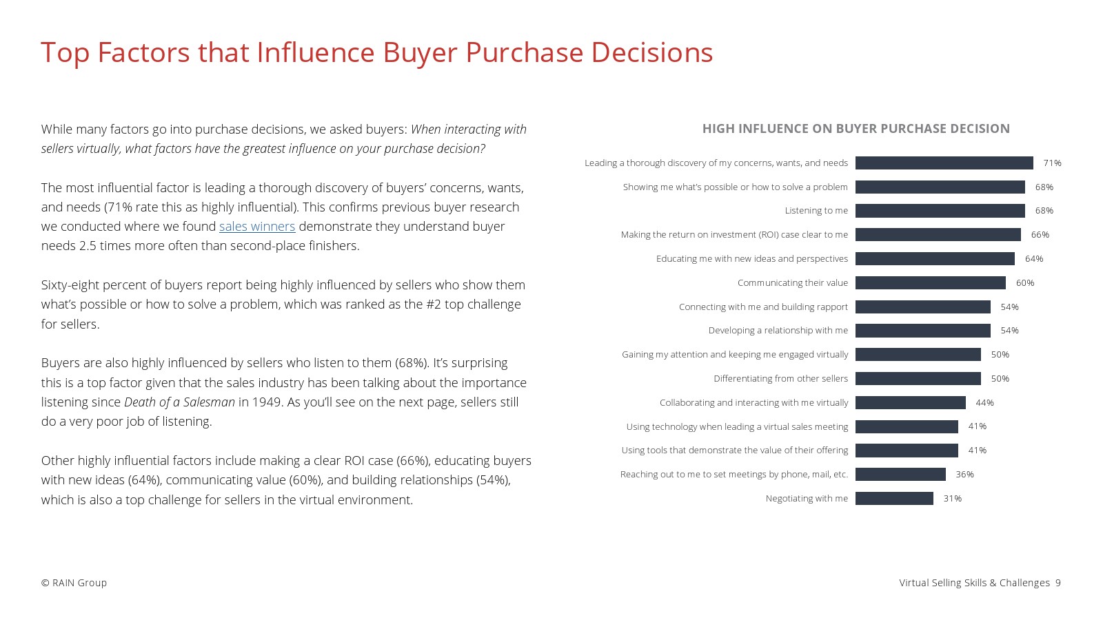 买家表示,他们有时会遇到卖家在在线会议期间使用不良或非视觉资产(86%)、没有做好准备(83%)、缺乏演示技能(80%)或者被外部因素分散注意力(77%)。