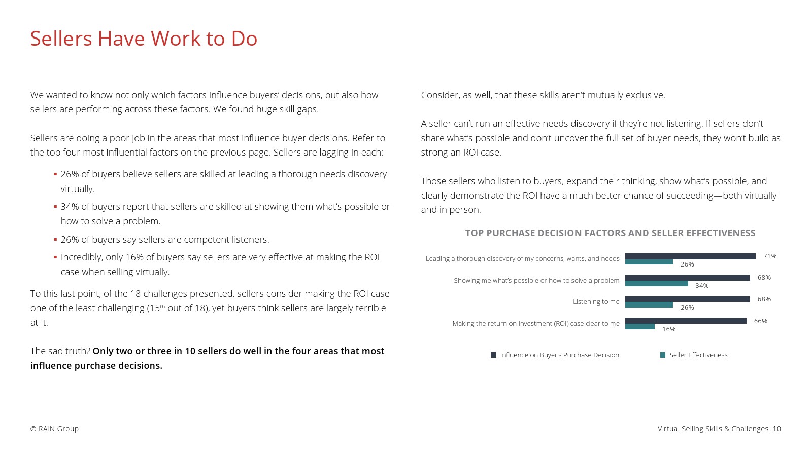 虽然买家表示,他们的购买决定受到虚拟参与度(50%),以及虚拟合作和互动(44%)的影响,但很少有人表示卖家在这些领域是有效的(分别为23%和34%)。