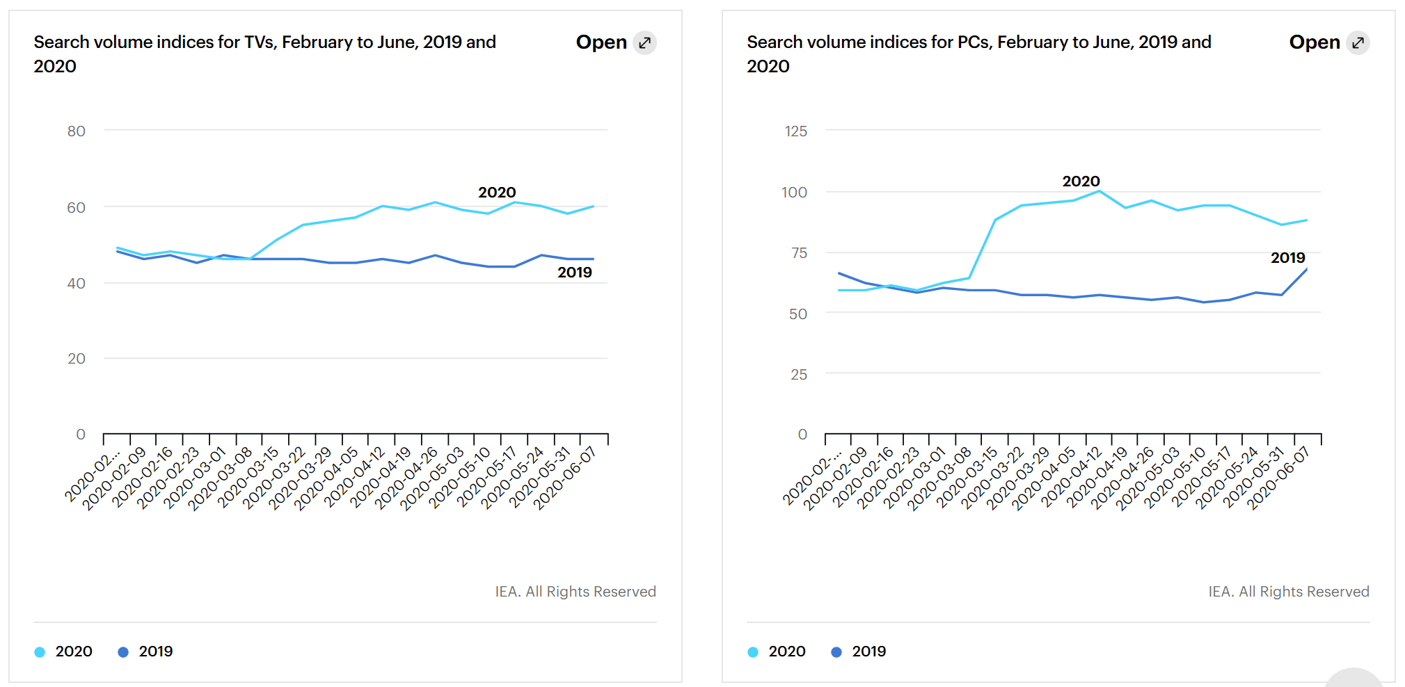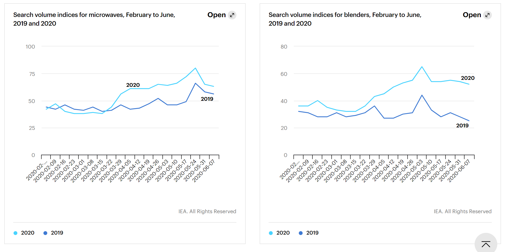 衡量公众兴趣的一种方法是查看谷歌趋势(Google Trends)的搜索量指数(SVI)。下面的数字比较了近几个月全球对“购物”类别中四种设备(PC、电视、微波炉和搅拌机)与去年的对比。这些数据并不反映实际销售额,但确实表明,自居家隔离开始以来,人们对家电的兴趣有所上升。