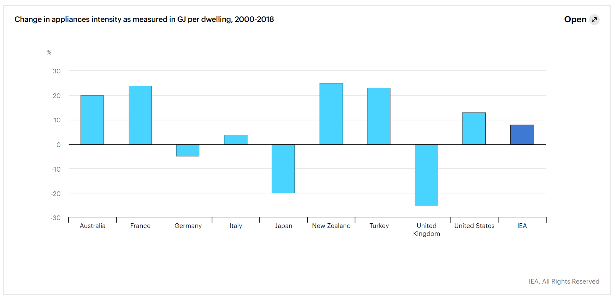因为家用电器是居民能源消耗的第二大来源,它们消耗了住宅总能耗的20%以上(供暖后),这一比例在过去几十年里一直在增长。而且,高达30%的居民碳排放来自于家用电器。