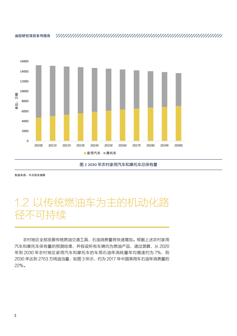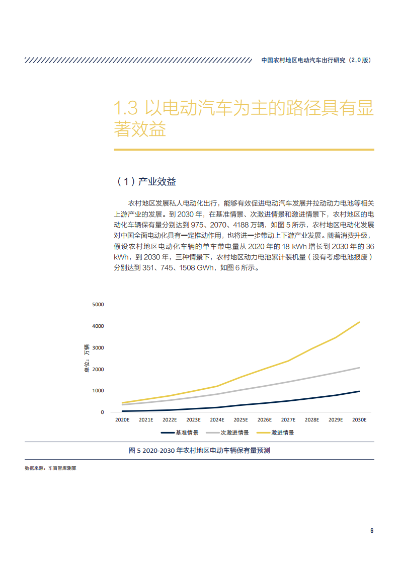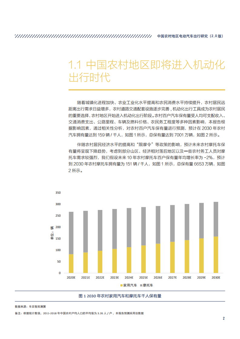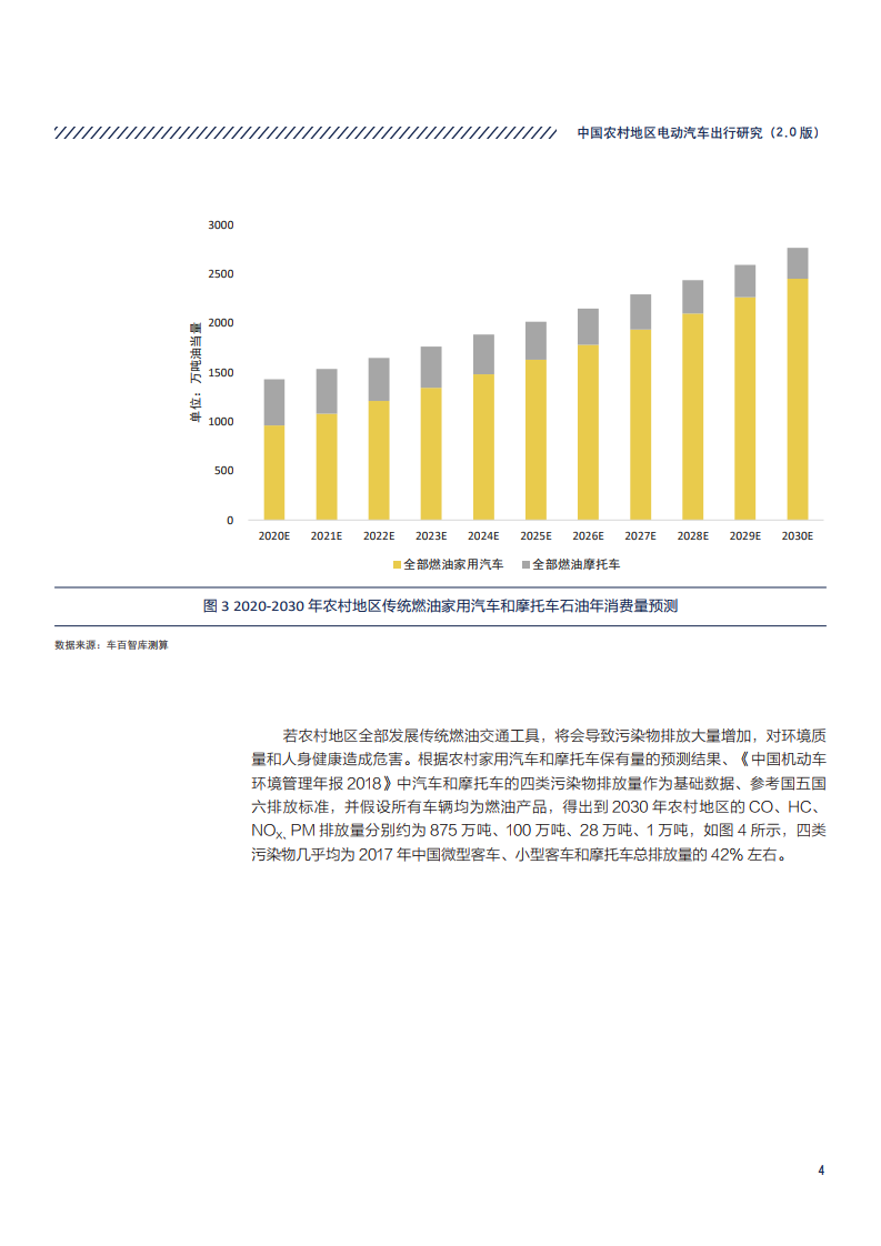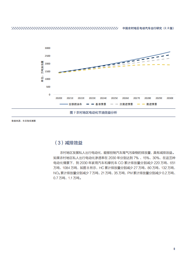 目前,我国农村地区汽车千人保有量约82辆,预计到2030年,这一数字将达到159辆,总保有量7001万辆。若农村地区全部使用传统燃油交通工具,到2030年,农村地区的一氧化碳(CO)、碳氢化合物(HC)、氮氧化物(NOX)和颗粒物(PM)年排放量分别约为875万吨、100万吨、28万吨、1万吨,四类污染物约等同于2017年中国微型客车、小型客车和摩托车总排放量的42%。为避免这一情况,以电动汽车替代燃油汽车将是农村地区推动机动化出行可持续发展的重要路径。