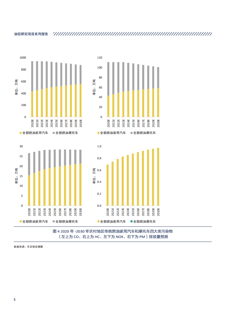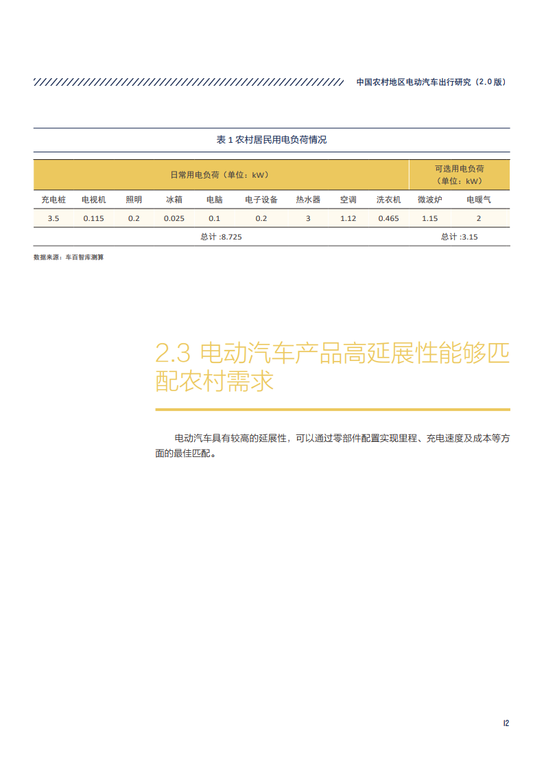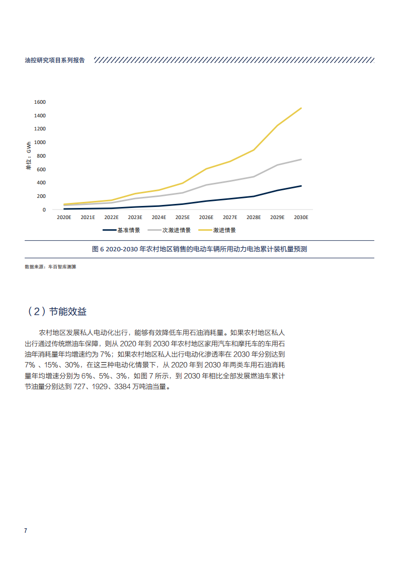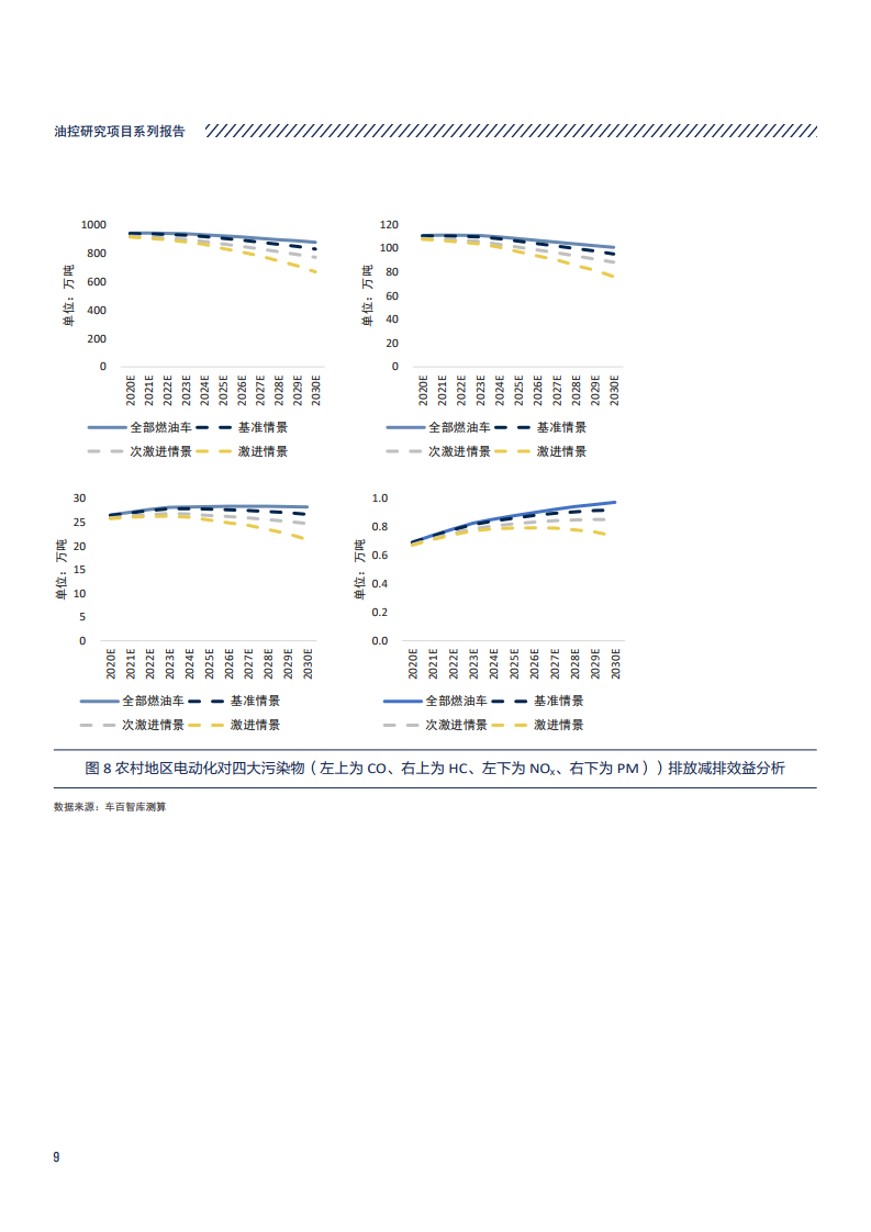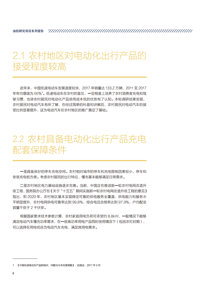 目前,我国农村地区汽车千人保有量约82辆,预计到2030年,这一数字将达到159辆,总保有量7001万辆。若农村地区全部使用传统燃油交通工具,到2030年,农村地区的一氧化碳(CO)、碳氢化合物(HC)、氮氧化物(NOX)和颗粒物(PM)年排放量分别约为875万吨、100万吨、28万吨、1万吨,四类污染物约等同于2017年中国微型客车、小型客车和摩托车总排放量的42%。为避免这一情况,以电动汽车替代燃油汽车将是农村地区推动机动化出行可持续发展的重要路径。