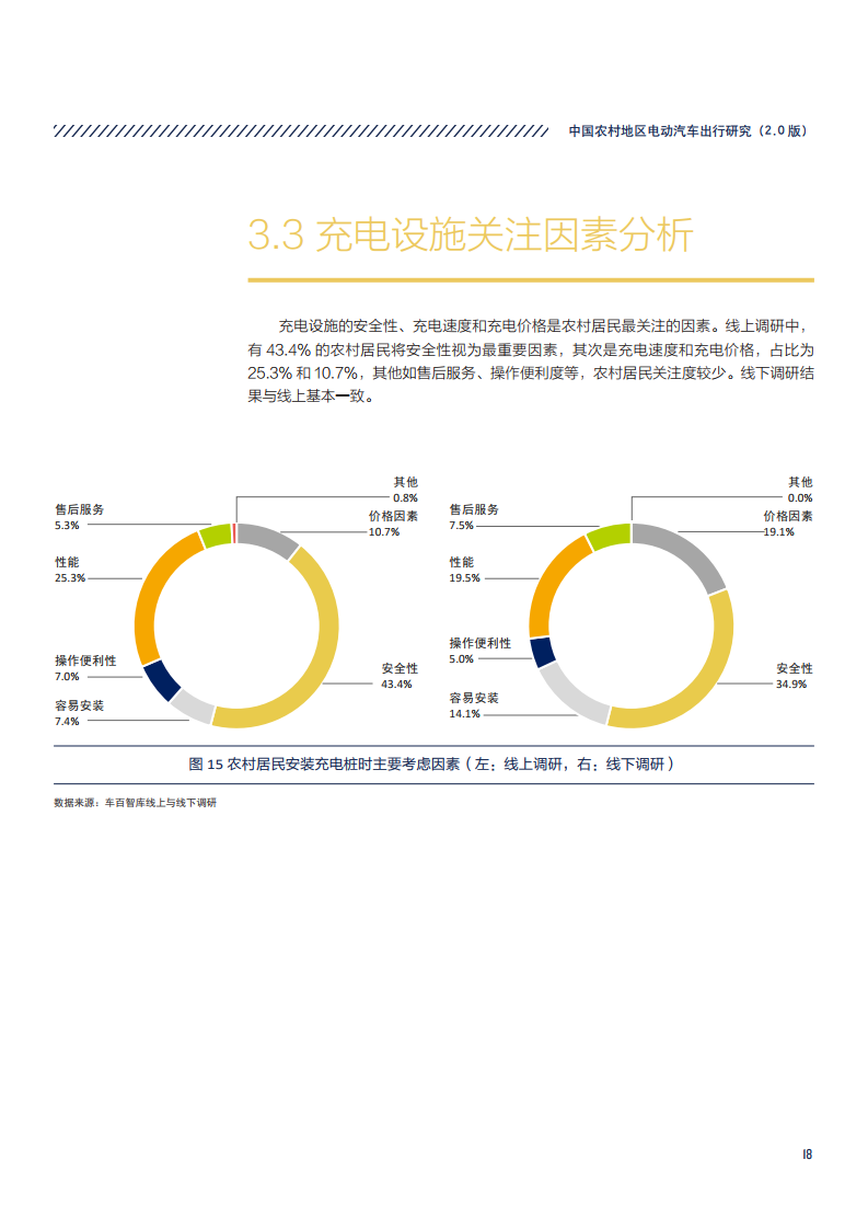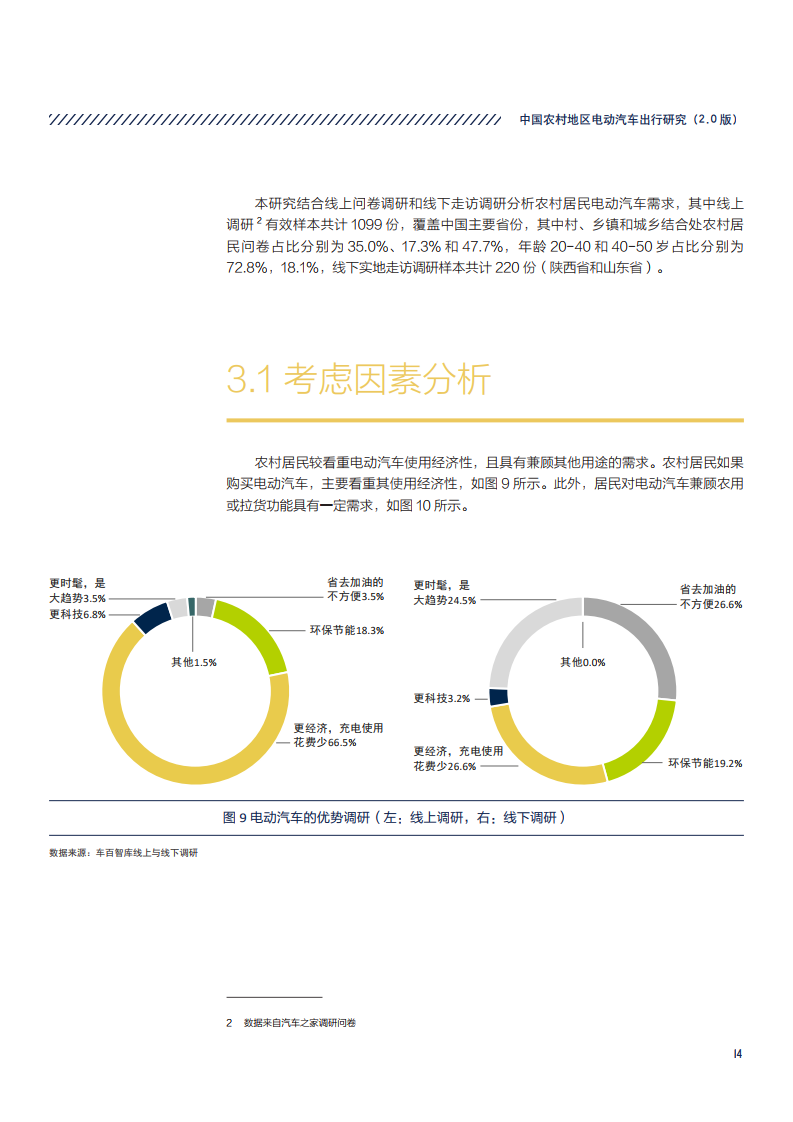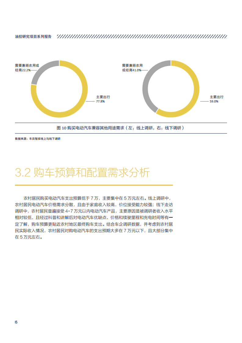 报告基于对1099份线上问卷和220份线下走访样本的分析发现,农村居民购买电动汽车主要看重其使用经济性。农村居民购买电动汽车的预算大多在7万元以下、且大部分集中在5万元左右。