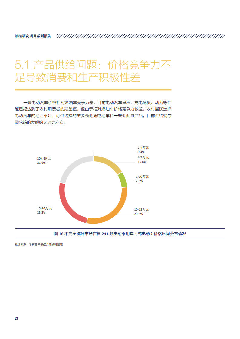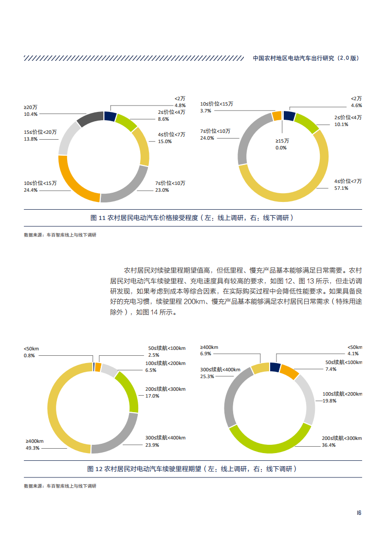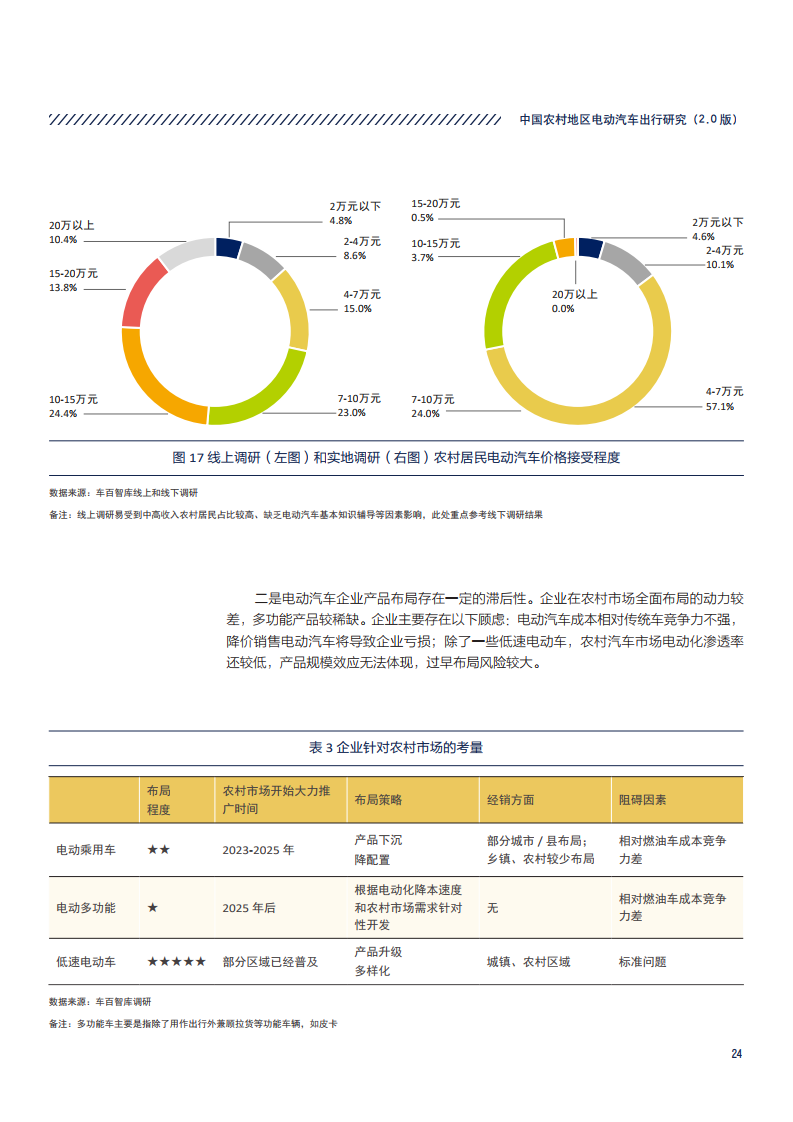 报告同时指出,基于对企业在农村市场布局情况的问卷分析,当前市面上在售的电动汽车,续驶里程、充电速度、动力等性能已经达到了农村消费者的期待,但因为相对燃油车的性价比不高而缺乏吸引力。目前车企提供的产品与农村居民的理想购车预算之间相差2万元左右。报告经过不完全统计,市场在售的241款主流纯电动乘用车中,7万元以下仅占16.2%。而市场的热度又直接影响到企业的热情,车企在农村地区布局电动化产品的意愿滞后。