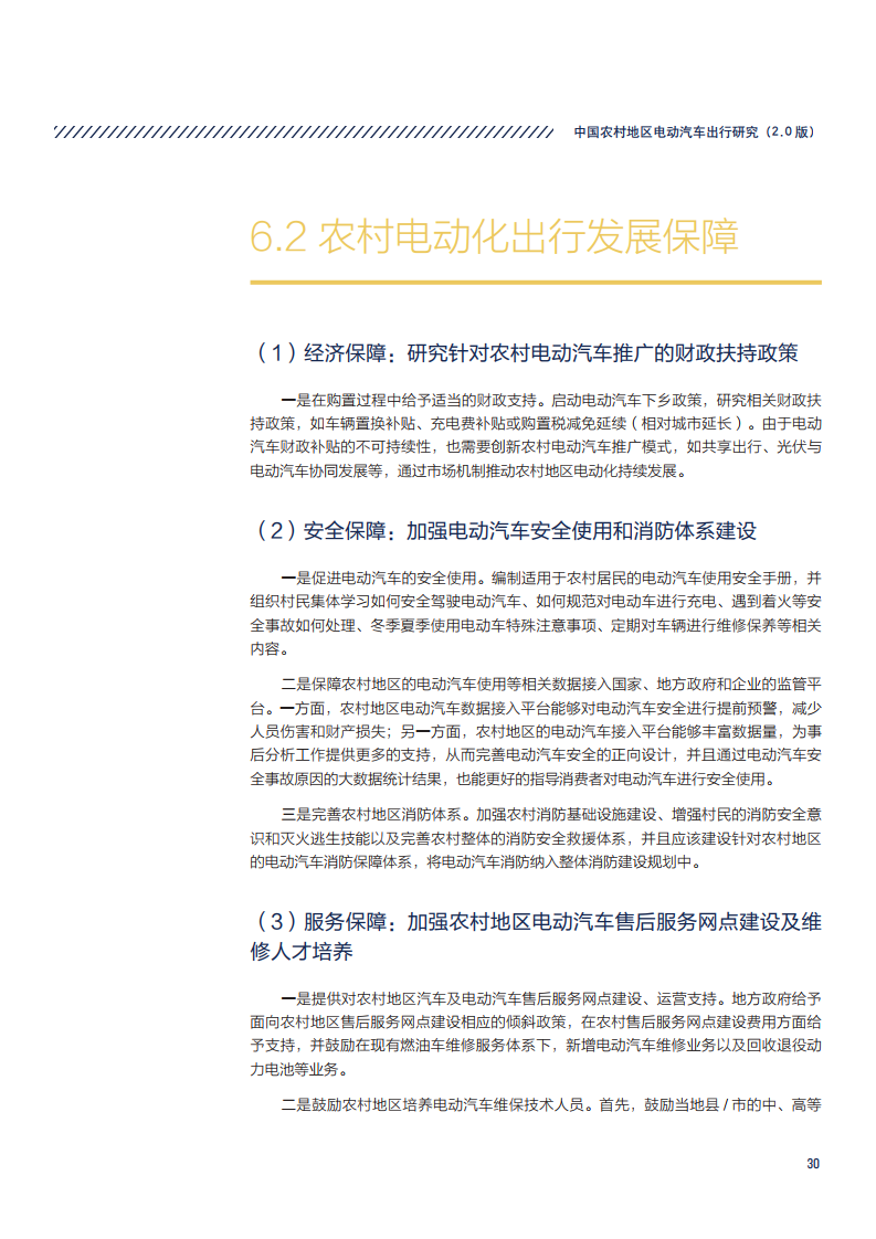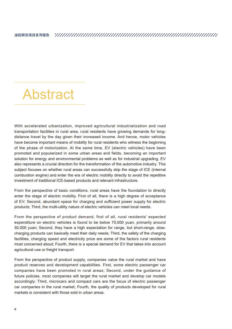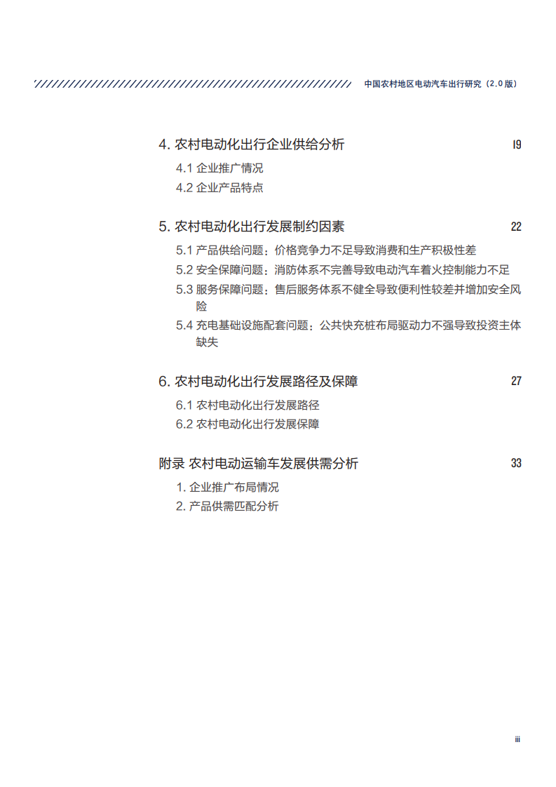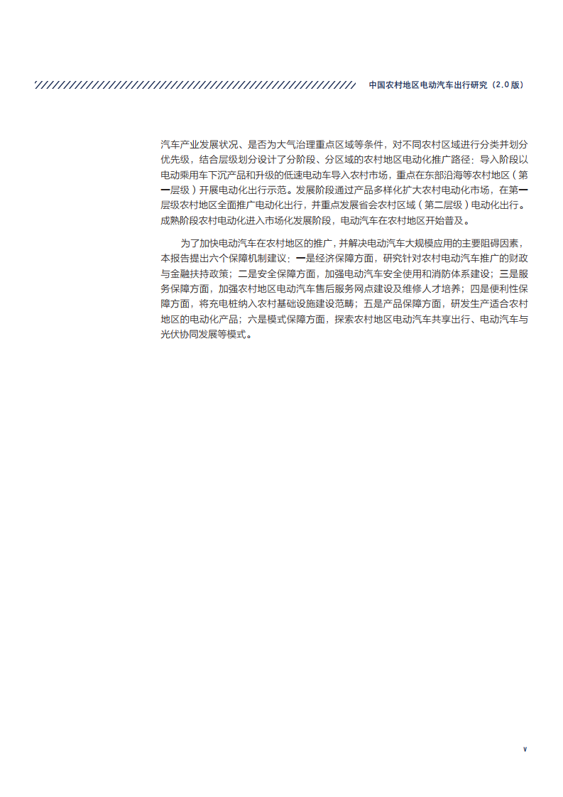 报告从农村电动化出行的背景与意义、基础条件、产品需求、企业供给、制约因素等多方面,深入分析了我国农村地区电动汽车的发展现状、面临问题,并就如何在农村地区推动电动化出行并减少交通引起的环境污染等问题提出了发展路径和保障建议。
