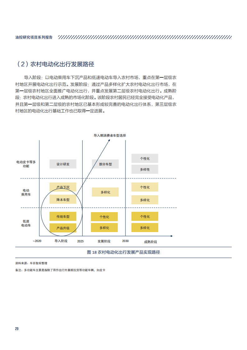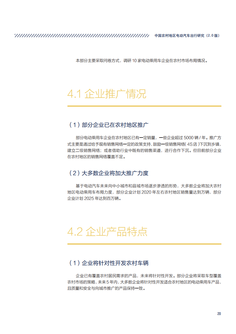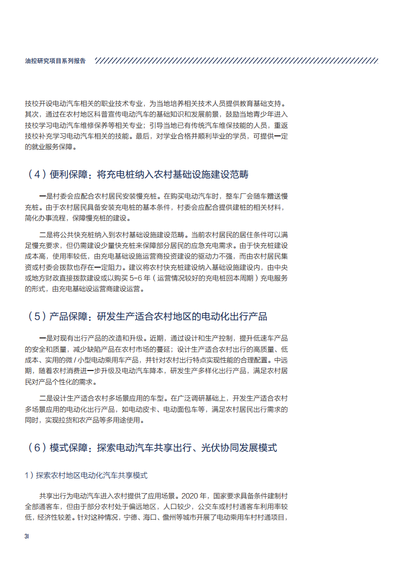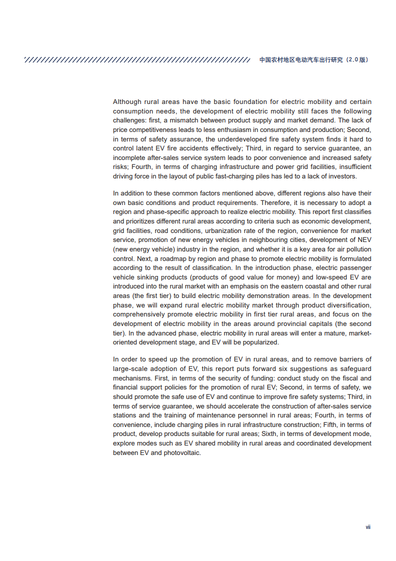 报告从农村电动化出行的背景与意义、基础条件、产品需求、企业供给、制约因素等多方面,深入分析了我国农村地区电动汽车的发展现状、面临问题,并就如何在农村地区推动电动化出行并减少交通引起的环境污染等问题提出了发展路径和保障建议。