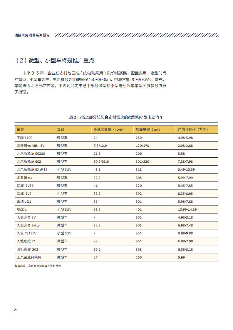 报告表示,当前农村具备发展经济型电动汽车的基本条件。农村相对城市具备较好的停车充电条件,电动汽车产品高延展性能够匹配农村差异化需求。同时,低速电动车培养了农村居民的充电和驾驶习惯。2019年,农村人均可支配收入达16021元,年收入超过5万元的家庭占比近6成(线上7成),具备微型小型电动汽车购买力。但是,农村地区电动汽车产品存在供需错位,制约电动汽车在农村地区推广。