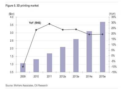 据咨询公司Wohlers Associates预测,3D打印市场规模将由目前的不足35亿美元增长至2019年的65亿美元。航天、整形外科等价值高、产量低的产业将首先采用3D打印技术。