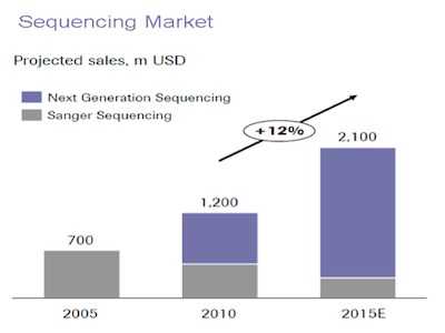 基因治疗市场规模将由2005年的7亿美元增长至2015年的21亿美元。目前,癌症筛查、产前检查和搭配诊断是基因治疗技术的三大应用领域。受益于这一技术的公司包括基因测序机器、试剂盒制造商,以及医生和病人。