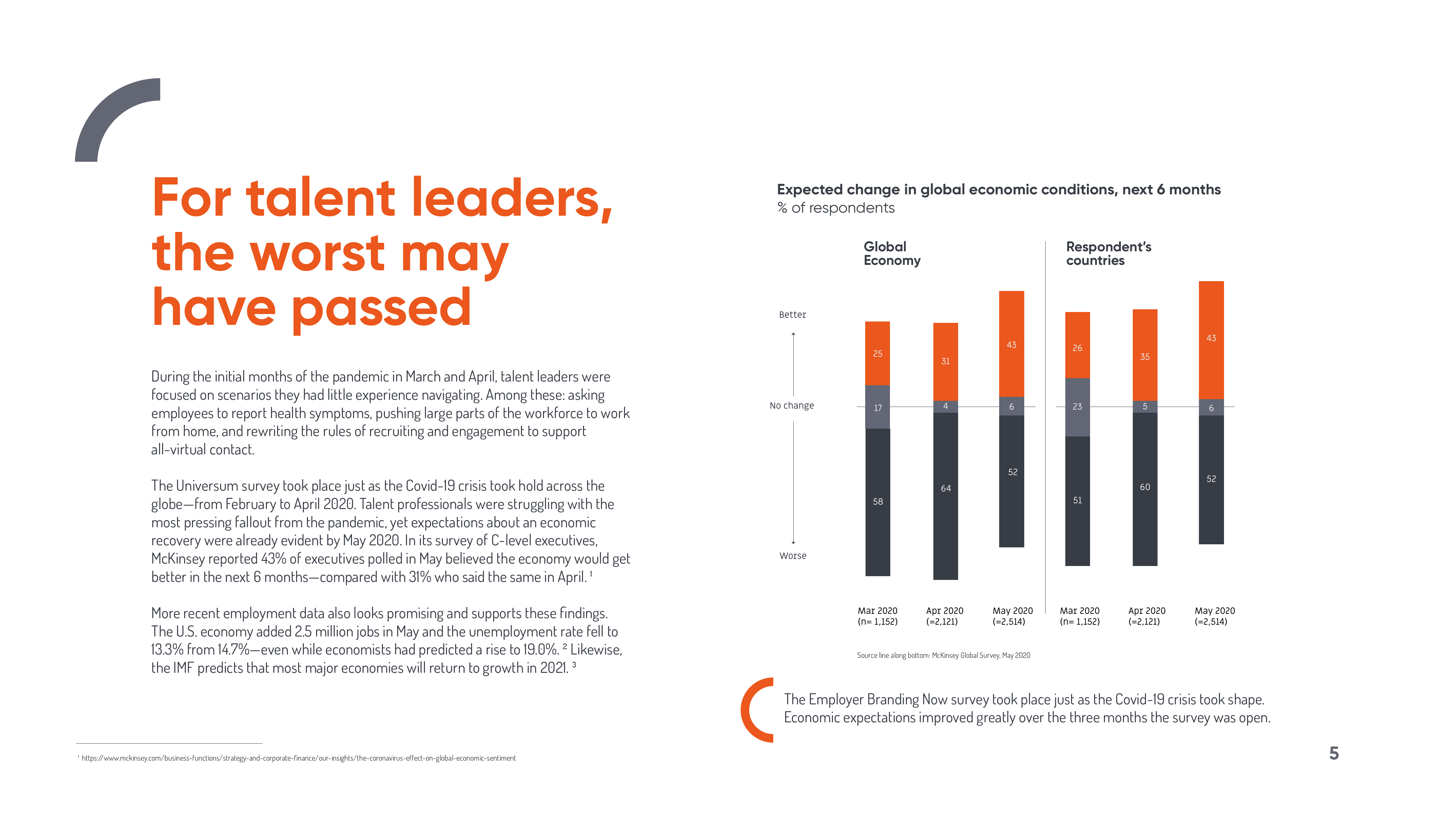 优兴咨询的调查是在2020年2月至4月Covid-19危机席卷全球之际进行的。专业人才正努力应对疫情最紧迫的影响,但到2020年5月,对经济复苏的预期已经很明显。麦肯锡在对c级高管的调查中称,5月份接受调查的高管中有43%认为经济将在未来6个月内好转,而4月份的这一比例为31%。