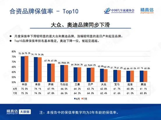 合资品牌中大众、奥迪品牌保值率同步下滑。从保值率上看,豪华品牌(国内生产)与主流合资品牌已经没有显著差异。BBA虽然仍名列前茅,但主流的日韩品牌在保值率这个指标上也有领先优势。二手车用户“务实”的特点得到充分验证。