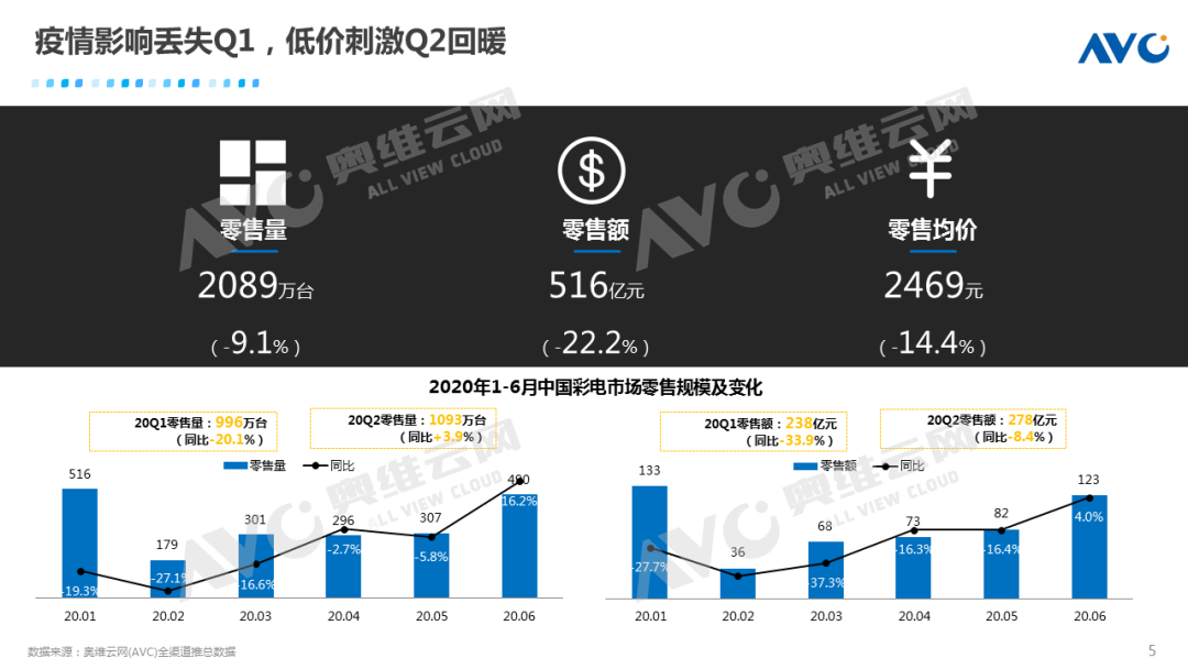 2020年一季度疫情爆发,中国彩电市场受疫情影响,规模丢失近三成。进入二季度,疫情发展得到控制,中国各地政府出台多种促进消费的政策鼓励消费,618促销+政府消费券的双重优惠,中国消费迅速回暖。二季度中国彩电市场零售量规模实现同比增长。整体来看,2020年上半年中国彩电市场零售量2089万台,同比下降9.1%,零售额516亿元,同比下降22.2%。