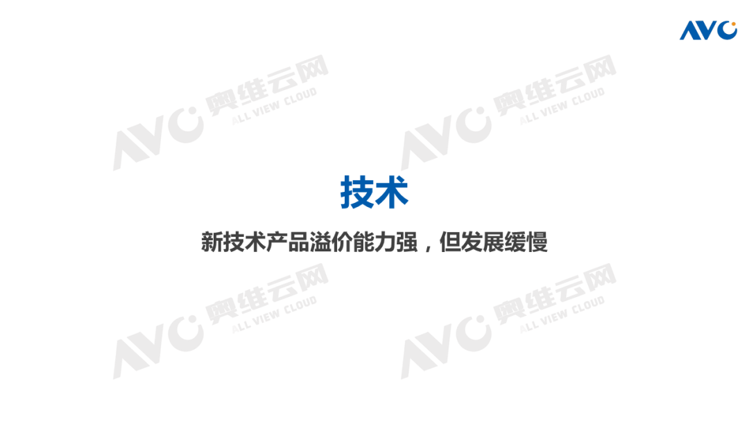 新技术产品的溢价力在1.5-4倍之间,但相关技术发展速度缓慢。目前各个新技术都形成自有的品牌阵营。