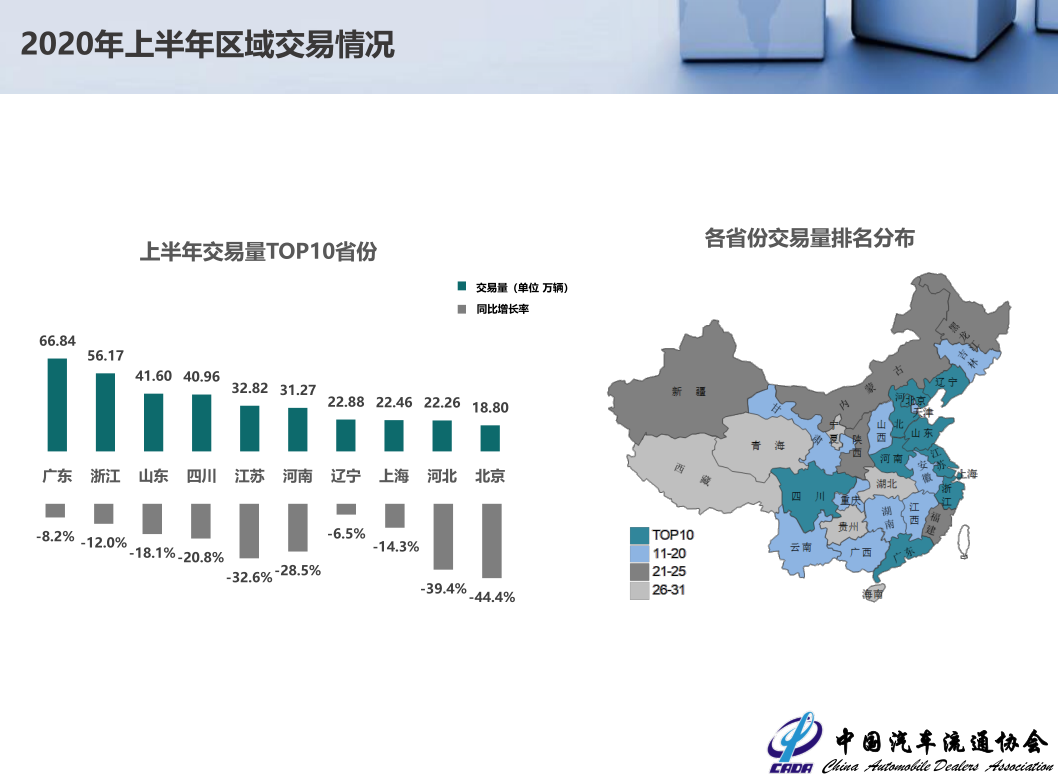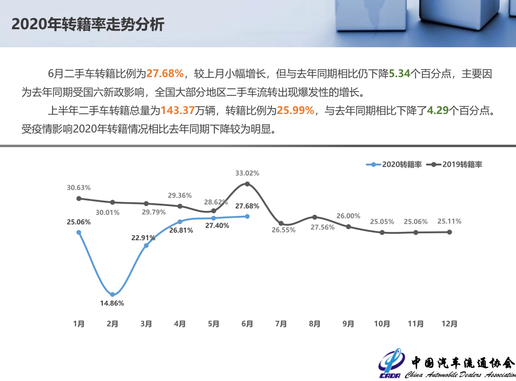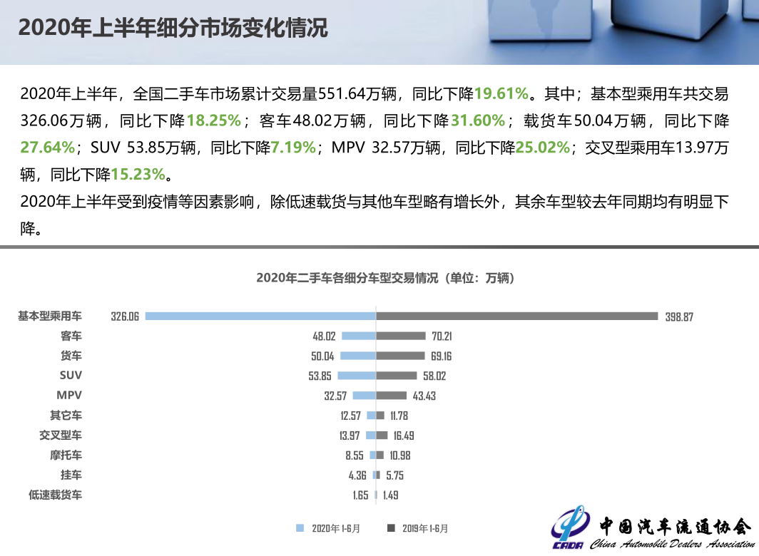 2020年上半年,全国二手车市场累计交易量551.64万辆,同比下降19.61%。其中;基本型乘用车共交易326.06万辆,同比下降18.25%;客车48.02万辆,同比下降31.60%;载货车50.04万辆,同比下降27.64%;SUV 53.85万辆,同比下降7.19%;MPV 32.57万辆,同比下降25.02%;交叉型乘用车13.97万辆,同比下降15.23%。
