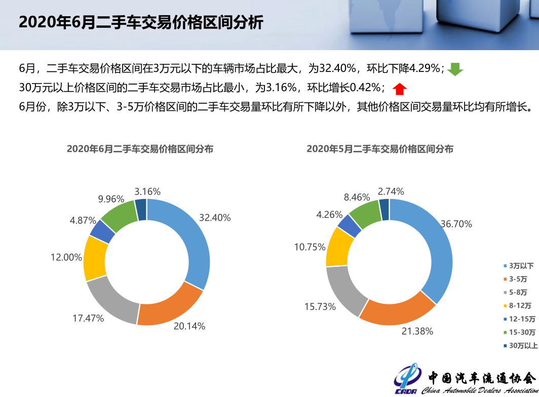 6月,二手车交易价格区间在3万元以下的车辆市场占比最大,为32.40%,环比下降4.29%;30万元以上价格区间的二手车交易市场占比最小,为3.16%,环比增长0.42%。