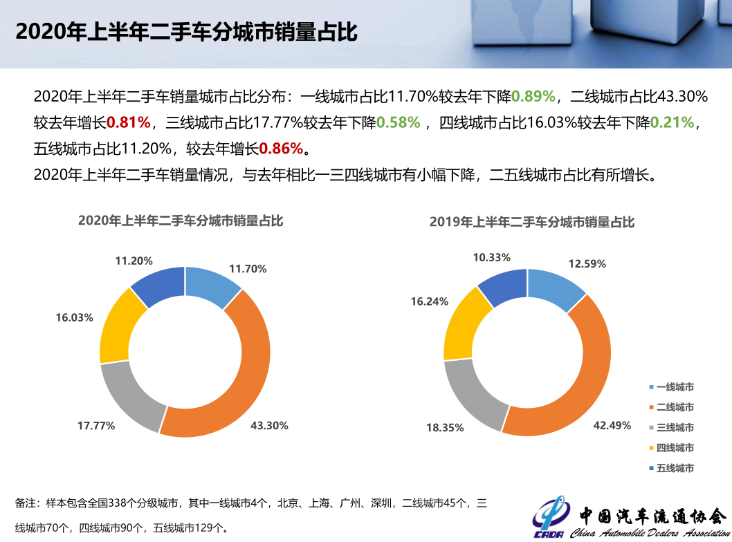 2020年上半年二手车销量城市占比分布:一线城市占比11.70%较去年下降0.89%,二线城市占比43.30%较去年增长0.81%,三线城市占比17.77%较去年下降0.58% ,四线城市占比16.03%较去年下降0.21%,五线城市占比11.20%,较去年增长0.86%。