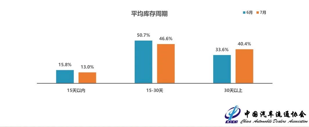 调研显示,7月份库存周期15天以内的企业占13%,较6月份下降2.7%。15-30天的企业为46.6%,较上月下降4.1%。库存周期30天以上的企业由6月的33.6%,增长为40.4%。7月的平均库存周期为34.9天,较6月份增加了2.2天。