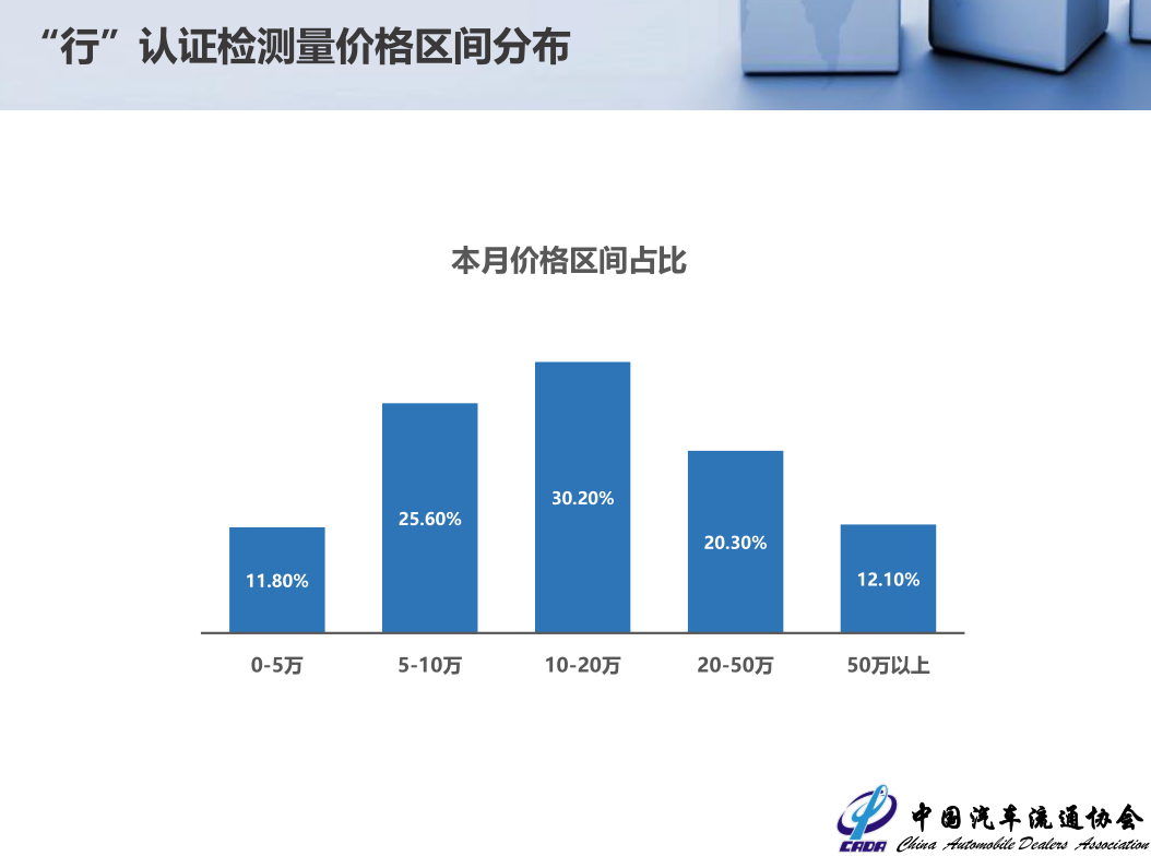 同比二手车价格区间分布:3万元及以下价格区间的车辆增长7.30%,3-5万区间增长0.37%,5-8万区间下降0.93%,8-12万区间下降1.18%,12-15万区间下降0.46%,15-30万区间下降3.78%,30万区间以上下降1.32%。