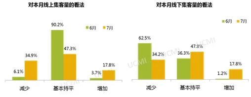 调查显示,7月份线上、线下集客量有所减少。其中认为线上集客量“持平”的经销商比例为47.3%,“增加”的比例为17.8%“减少”的比例为34.9%;认为线下集客量“增加”的经销商比例为17.8%,“持平”的比例为47.9%,“减少”的比例为34.2%。
