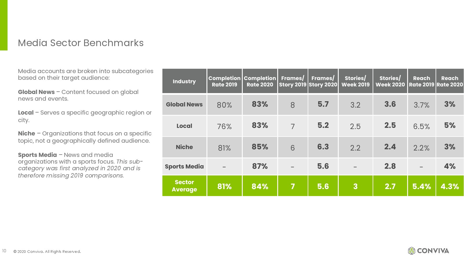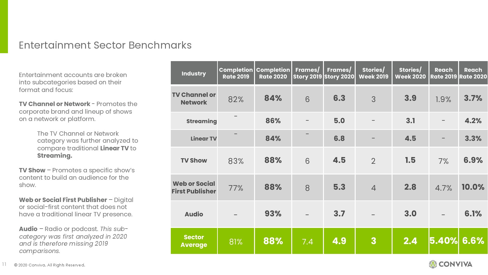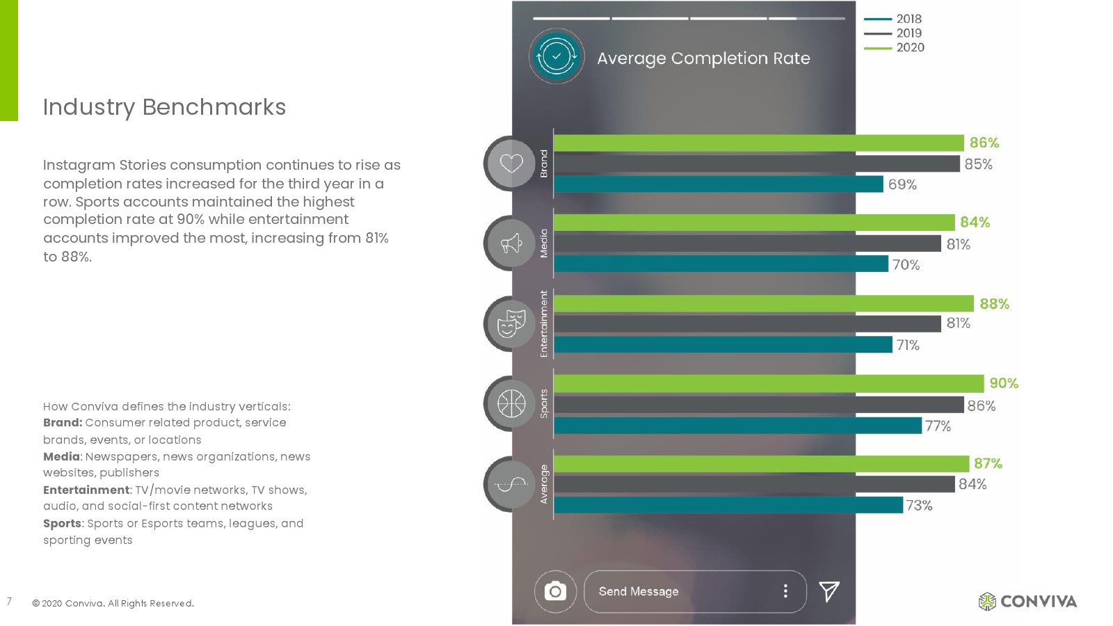 Conviva发布了“2020年Instagram Stories基准报告”。Instagram的10亿多用户中有超过一半每天都在发布和收看Stories,平均完成率从2018年的73%上升到2020年的87%。