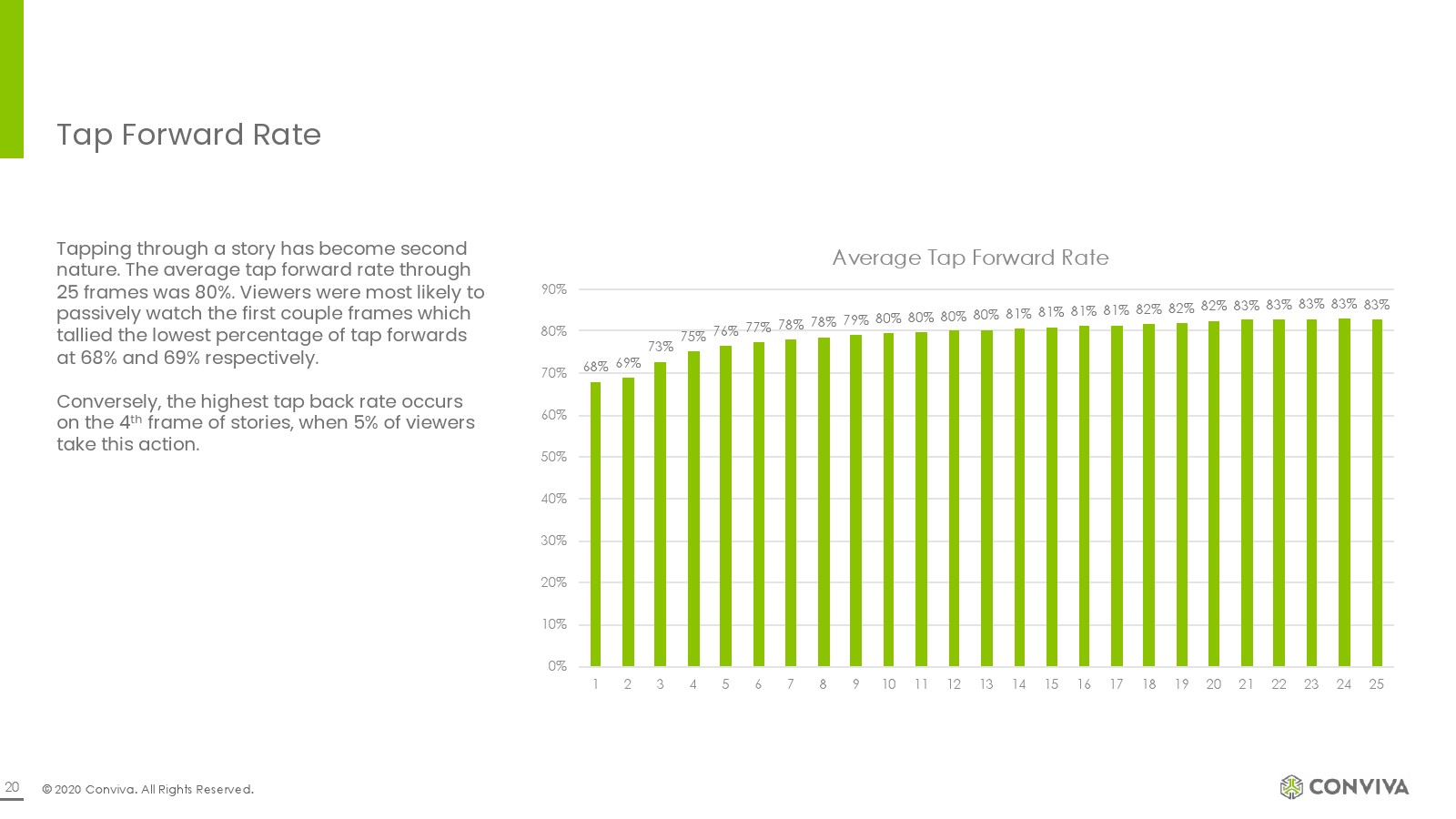 点击转发是最常见的观看Stories的方式,这一点表现在很高的点击转发率上,25帧的Stories平均有80%的点击转发。Storie第一帧的跳动前进率最低(68%),但逐渐增加,在第21帧时达到83%。