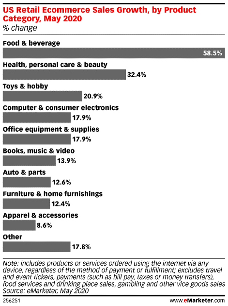 eMarketer预测,在转向数字渠道购买必需品的过程中,食品和饮料将成为今年增长最快的类别,同比增长58.5%,其次是健康/个人护理/美容,增幅为32.4%。