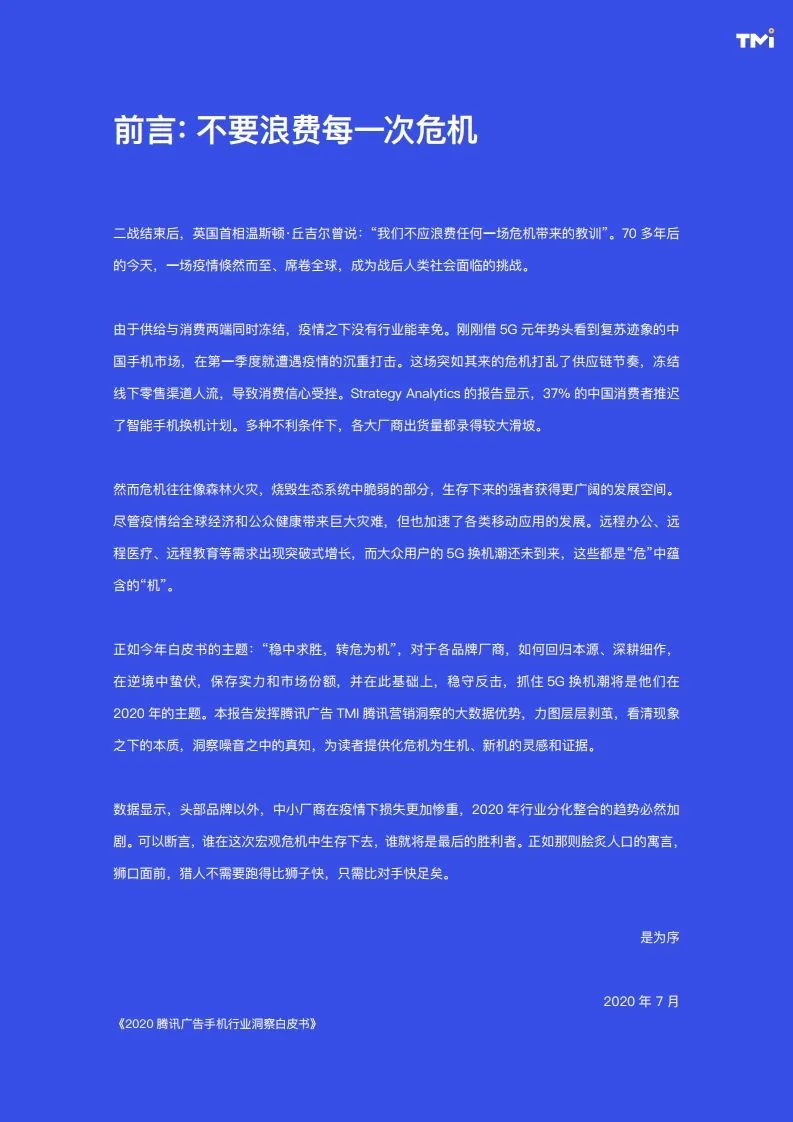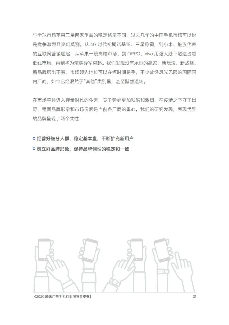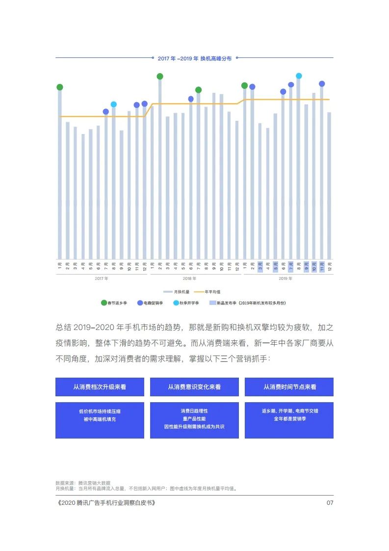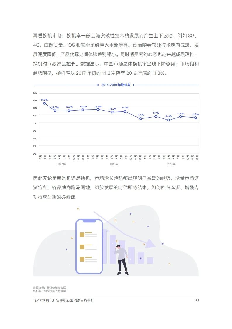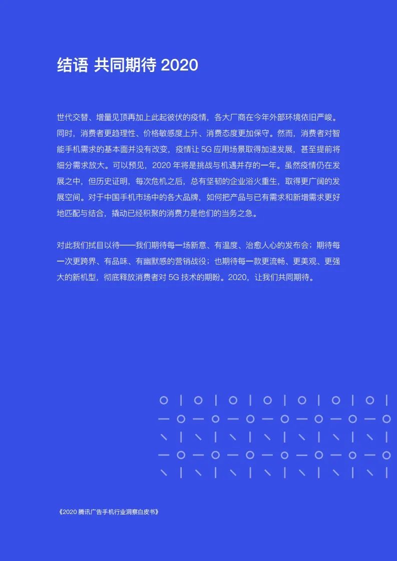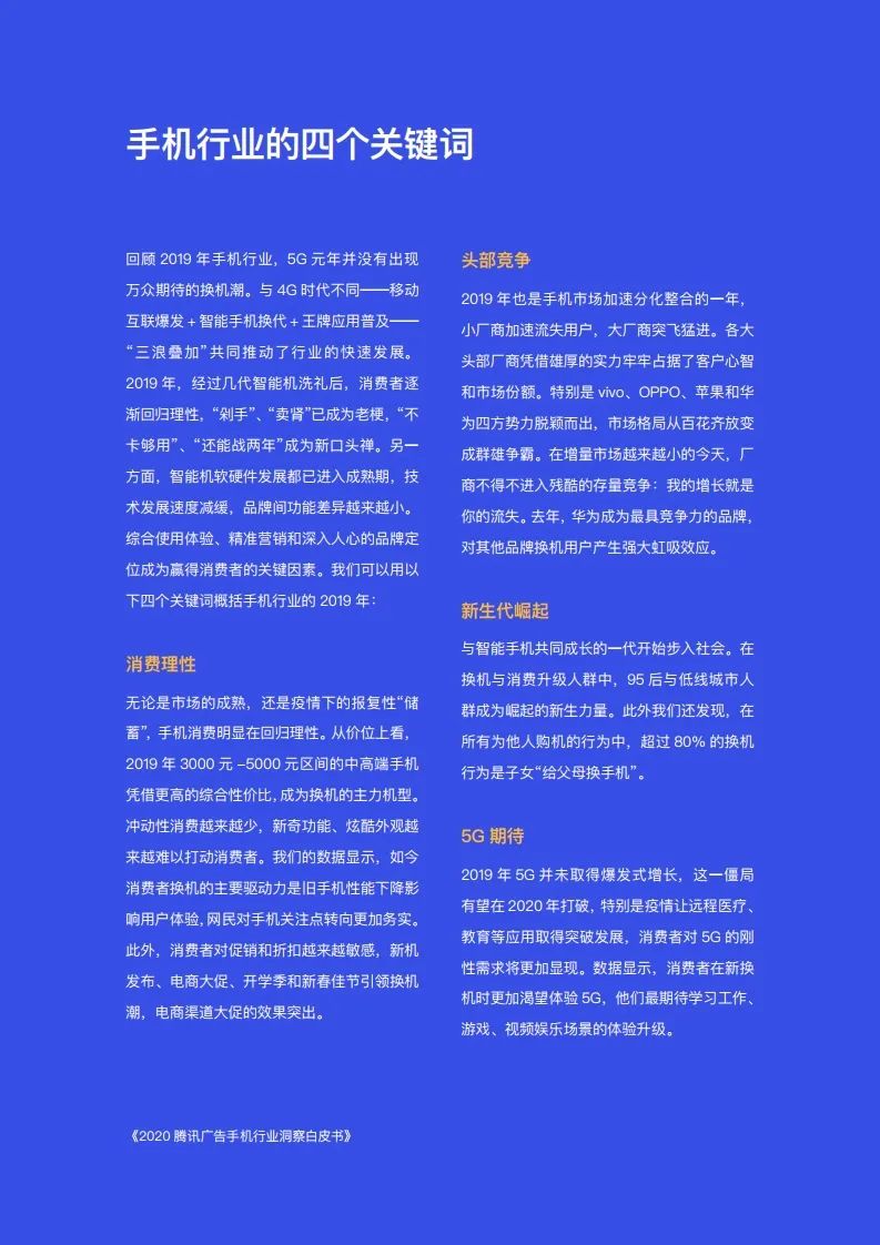 在此背景下,腾讯营销洞察(TMI)发布《2020腾讯手机行业洞察白皮书》。对于各品牌厂商,如何回归本源、深耕细作,在逆境中蛰伏,保存实力和市场份额,并在此基础上,稳守反击,抓住5G换机潮将是他们在2020年的主题。本报告发挥腾讯营销洞察(TMI)的大数据优势,力图层层剥茧,看清现象之下的本质,洞察噪音之中的真知,为读者提供化危机为生机、新机的灵感和证据。