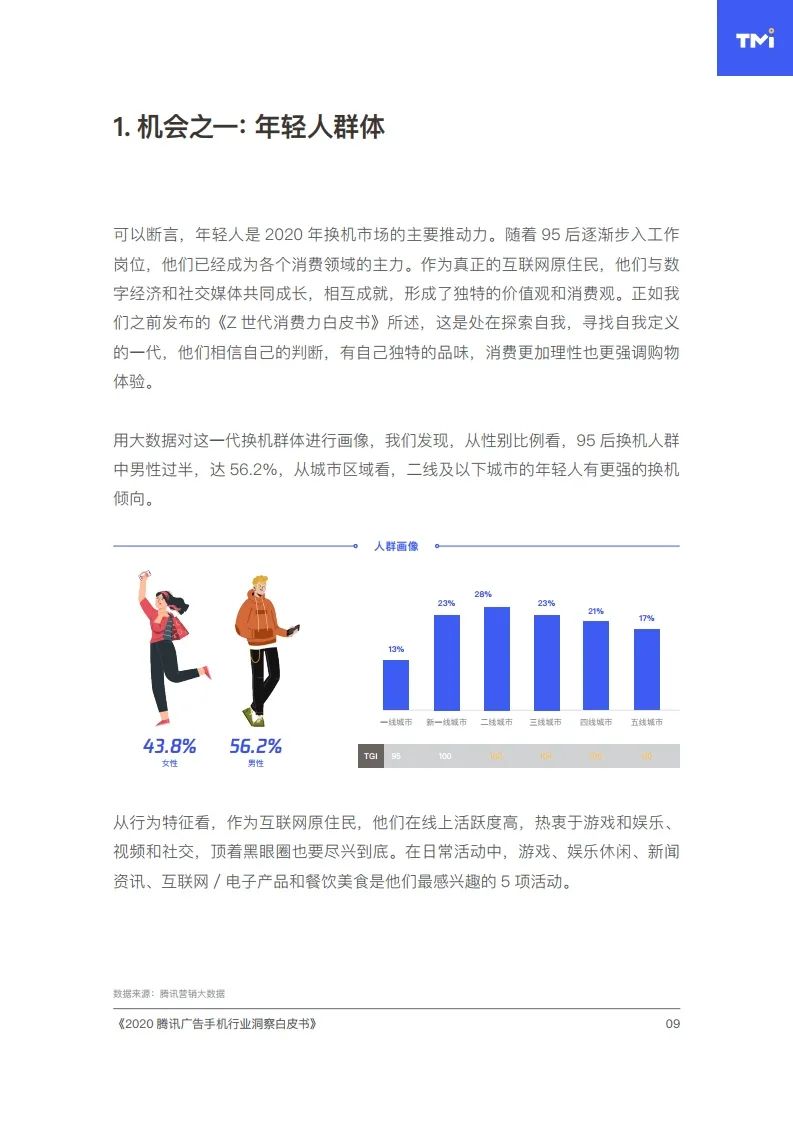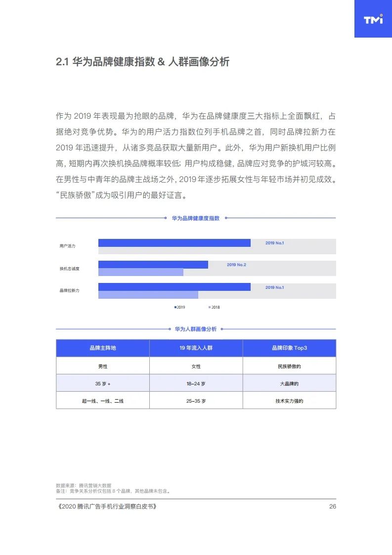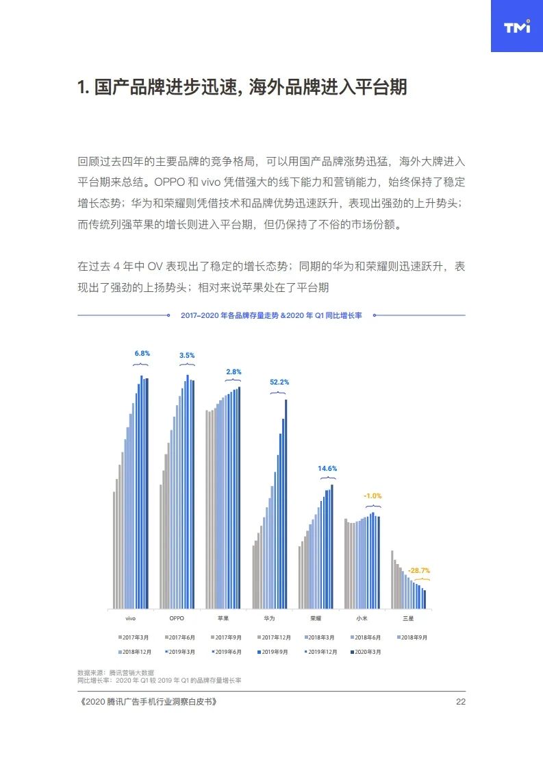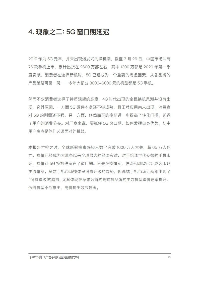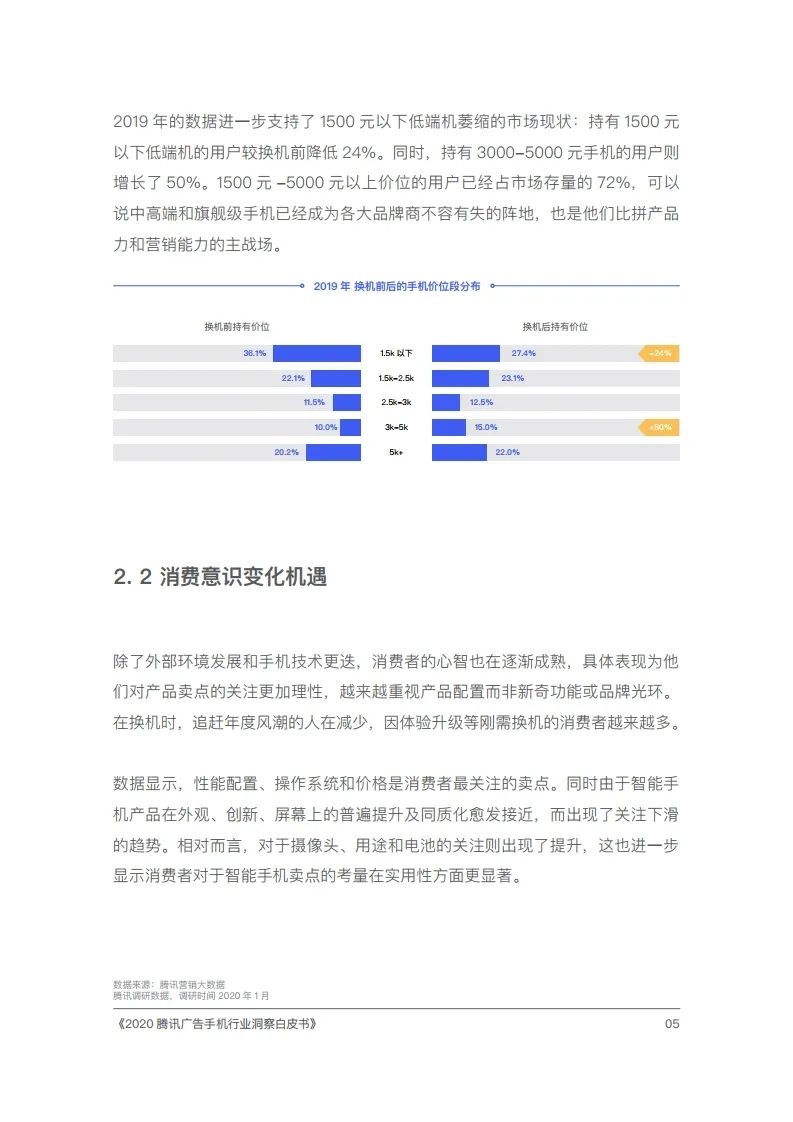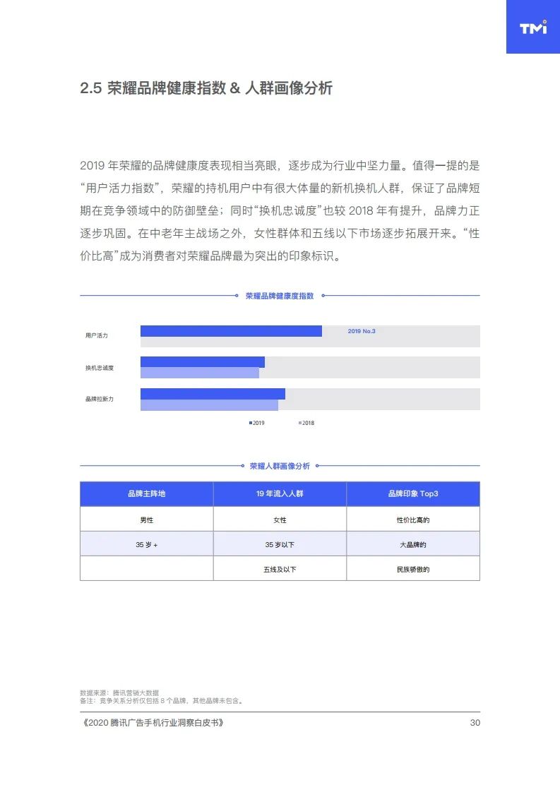 在此背景下,腾讯营销洞察(TMI)发布《2020腾讯手机行业洞察白皮书》。对于各品牌厂商,如何回归本源、深耕细作,在逆境中蛰伏,保存实力和市场份额,并在此基础上,稳守反击,抓住5G换机潮将是他们在2020年的主题。本报告发挥腾讯营销洞察(TMI)的大数据优势,力图层层剥茧,看清现象之下的本质,洞察噪音之中的真知,为读者提供化危机为生机、新机的灵感和证据。