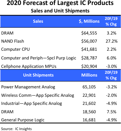 研究机构还预计,DRAM将成为今年集成电路领域出货量最大的产品类别。受疫情影响,计算机的出货量增加,已满足不断增加的在线业务、教育和电子商务等的需求,DRAM的出货量预计增长7.5%,达到186亿。