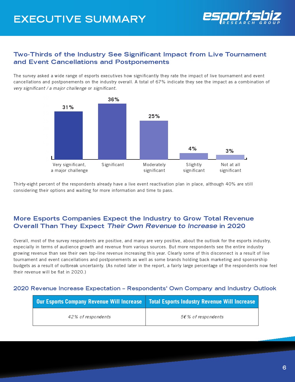 由于竞争对手无法出行,58%的受访者已经感受到危机的影响。他们表示,新冠肺炎对现场直播赛事的影响是未来1-2年影响电竞行业的最重要的趋势和问题之一。