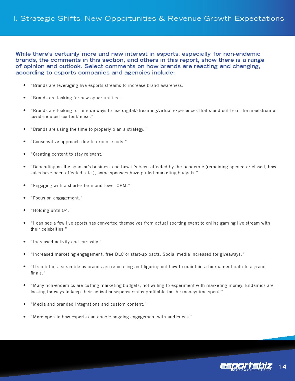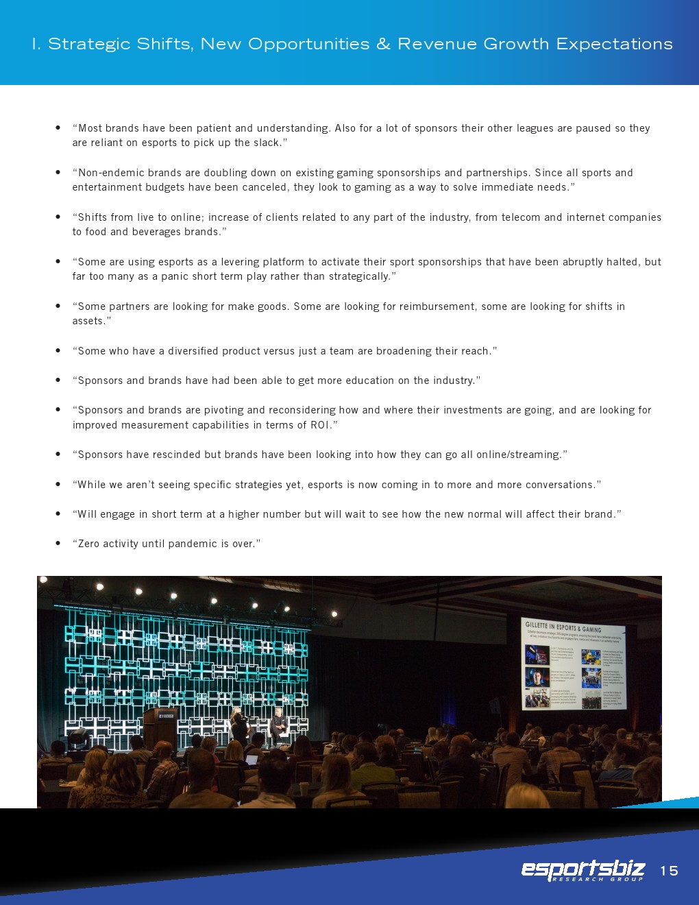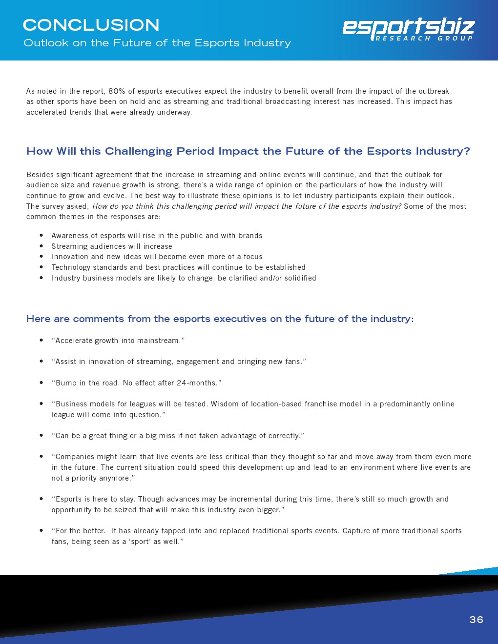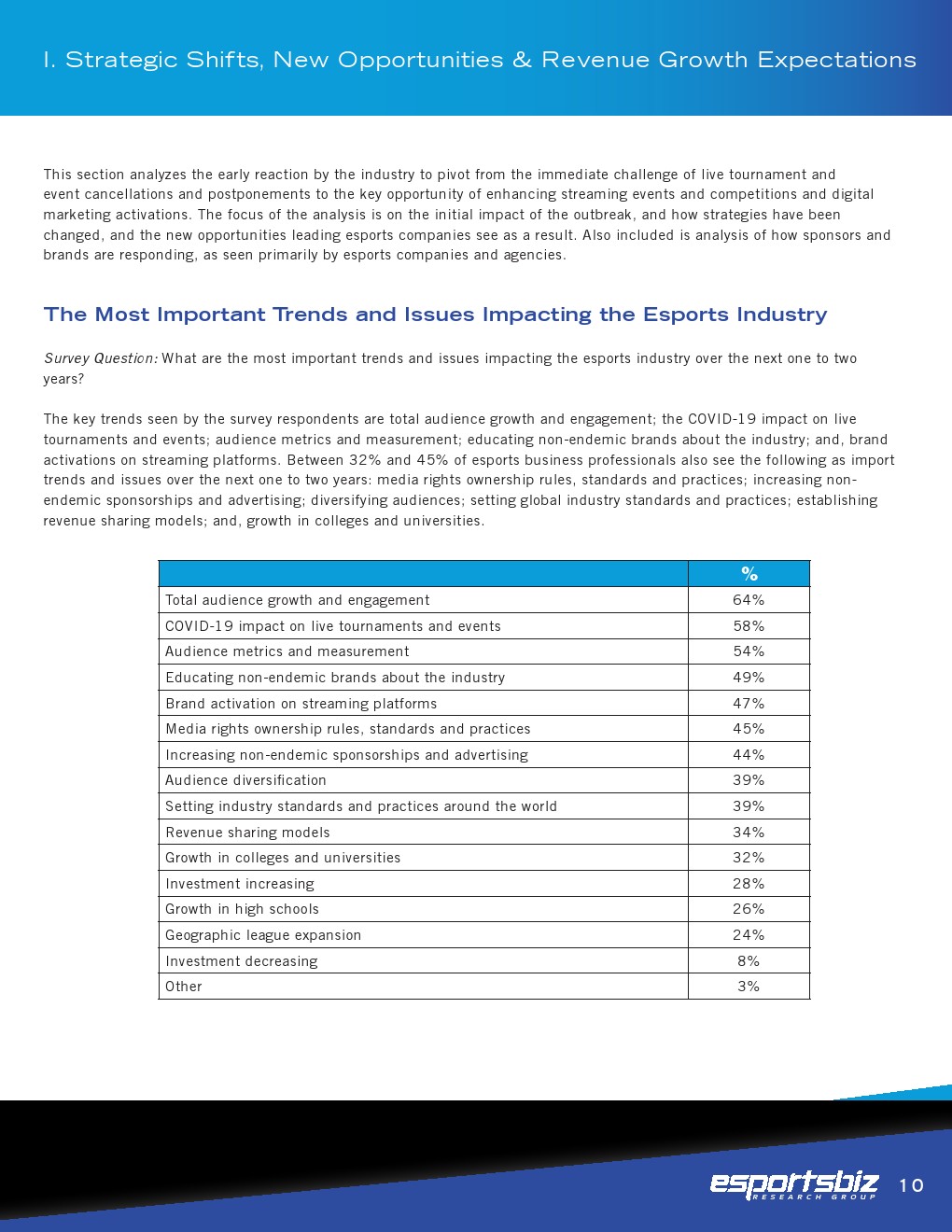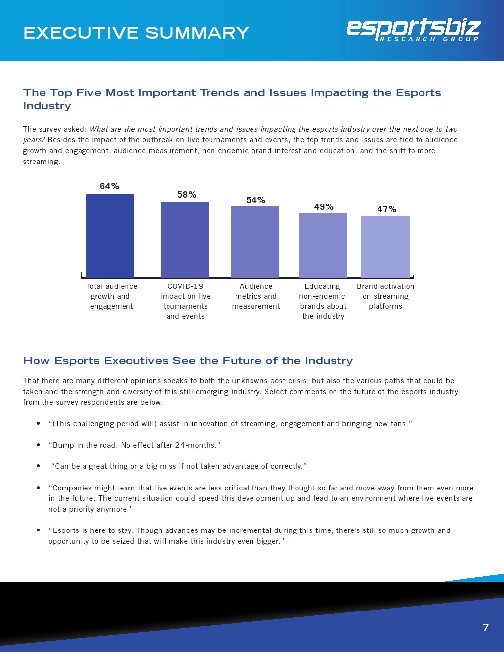但是,在影响该行业的最重要的问题和因素中,新冠肺炎的影响并不是最重要。受访者指出的最大趋势是受众增长和参与度(64%),其他趋势包括流媒体平台上的品牌激活(47%)和高校的增长(32%)。突显了在这个困难时期继续进步的愿望,这是可以理解的。尽管将增加投资作为最大趋势的比例相对较低(28%),这可能表明了一定程度的不确定性,但只有8%的受访者认为投资减少是主要趋势。