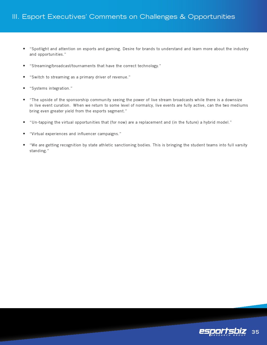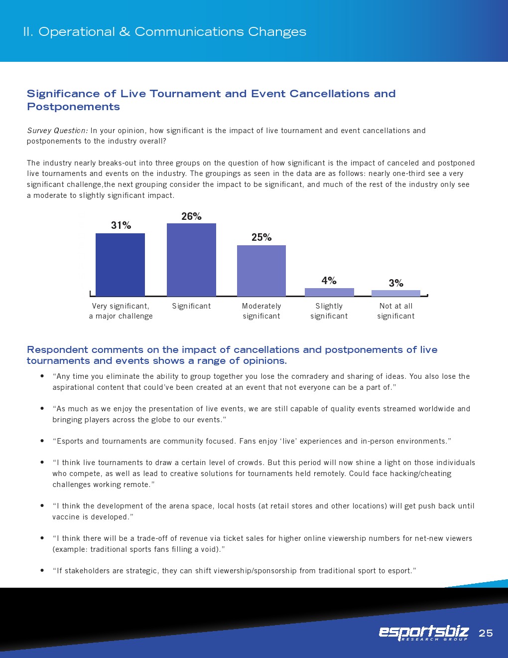 受访者指出公司受到疫情影响的方式有很多。与许多其他行业一样,停止面对面互动也产生了重大影响,34%的受访者表示直播锦标赛已被取消,另外3/10的受访者指出直播锦标赛已被推迟。
