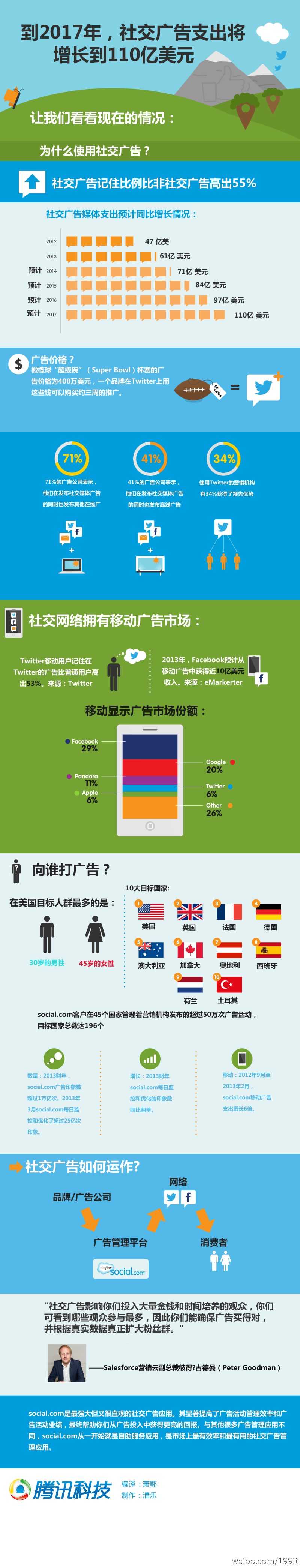 Social:预测2017年全球社交广告支出达110亿美元–数据信息图 更多阅读:Kenshoo:2015年Q4全球社交广告支出暴涨了50%零售商的新机会: GEO+LBS+Social–趋势分析MDG Advertising:旅行者如何使用社会媒体?–数据信息图2012年伦敦奥运会社交媒体–数据信息图国外企业偏爱的社会化媒体和使用原因–数据信息图社会化媒体的ROI(投资回报率)–数据信息图大品牌如何在Facebook上进行市场营销–数据信息图Nanigans:Facebook的电子商务广告–数据信息图Kenshoo:2015 Q3 亚太地区移动搜索广告支出同比增长61%选择合适的social代理公司的十大总结eMarketer:2011年Facebook广告收入翻番达到38亿美元eMarketer:预计2012年Facebook社交广告营收或接近60亿美元eMarketer:研究显示在北美单用户社交广告花费仍是最高的Kenshoo:2016年Q2 社交广告支出年增幅47%BusinessInsider:Social + Mobile = Smobile