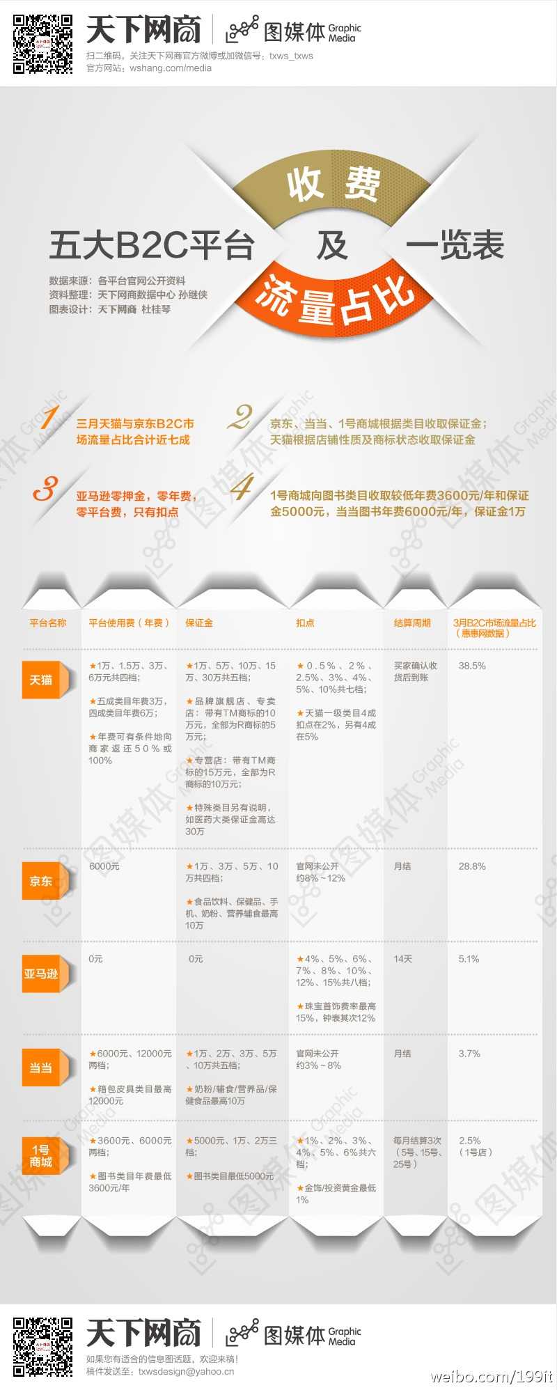 天下网商:五大B2C平台收费及流量占比–数据信息图 更多阅读:天下网商:从双十一解读在线零售现状天下网商:解密中国化妆品零售渠道天下网商:化妆品电商野蛮生长 洗白成行业必经之路天下网商:数据解读中国服装电子商务走向何方?(上)天下网商:数据解读不一样的3.21订货会–行业篇天下网商:如何提高网店销量–信息图天下网商:2011中国B2C在线零售商30强榜单:天猫商城居首移动互联网如何改变零售行业?–数据信息图Monetate:关于包邮背后的数据真相–数据信息图IBM:2012年黑色星期五调查报告:9.8%用iPad 8.7%用iPhone进行网购–数据信息图199IT天猫数据:2012年1111购物狂欢节数据大揭秘–数据信息图用户为什么抛弃购物车–数据信息图全球用户网络购物态度调查报告–数据信息图2012年在线小企业假日展望–数据信息图尼尔森:全球觅食渠道网络化–数据信息图