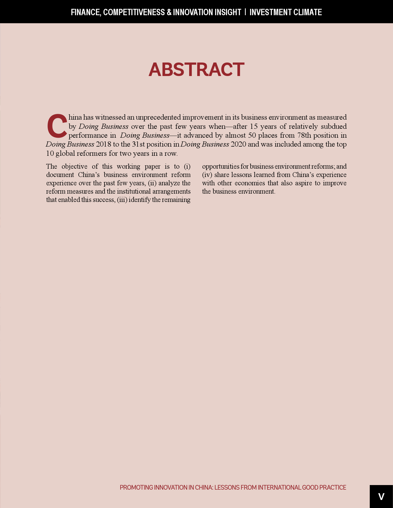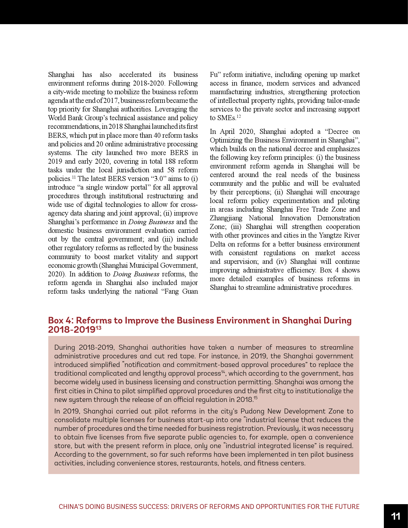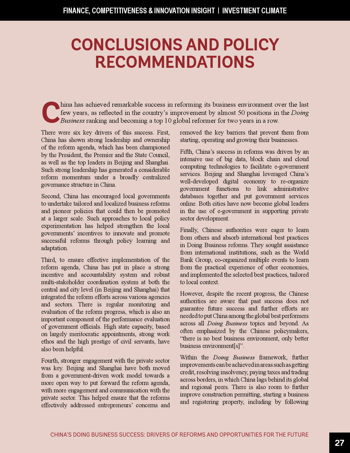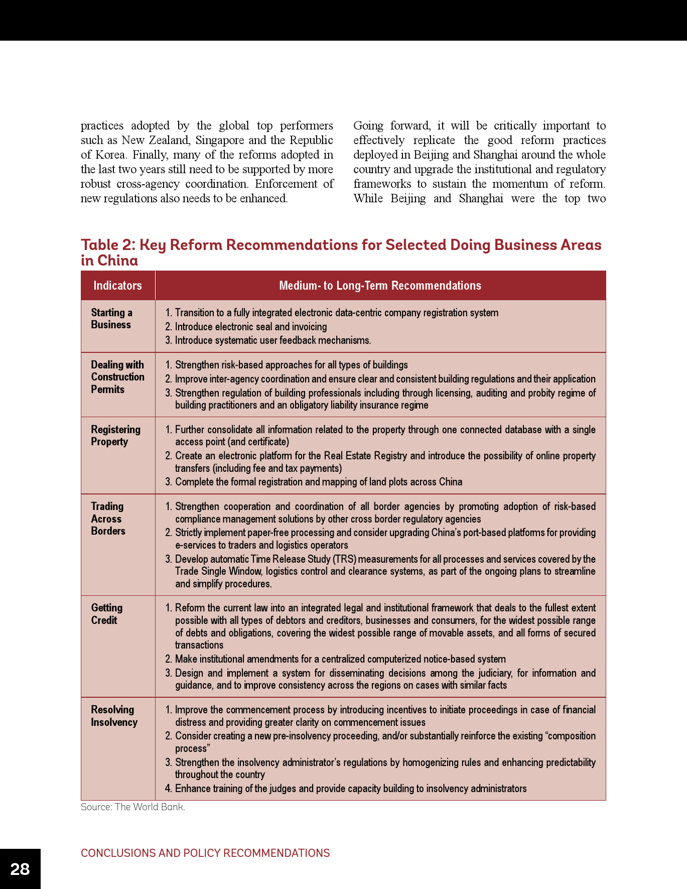 - 虽然近年来取得了成功,但仍需进一步努力使中国的营商环境达到世界前沿,包括在《营商环境报告》评估的领域以及超出其范围的其它领域。