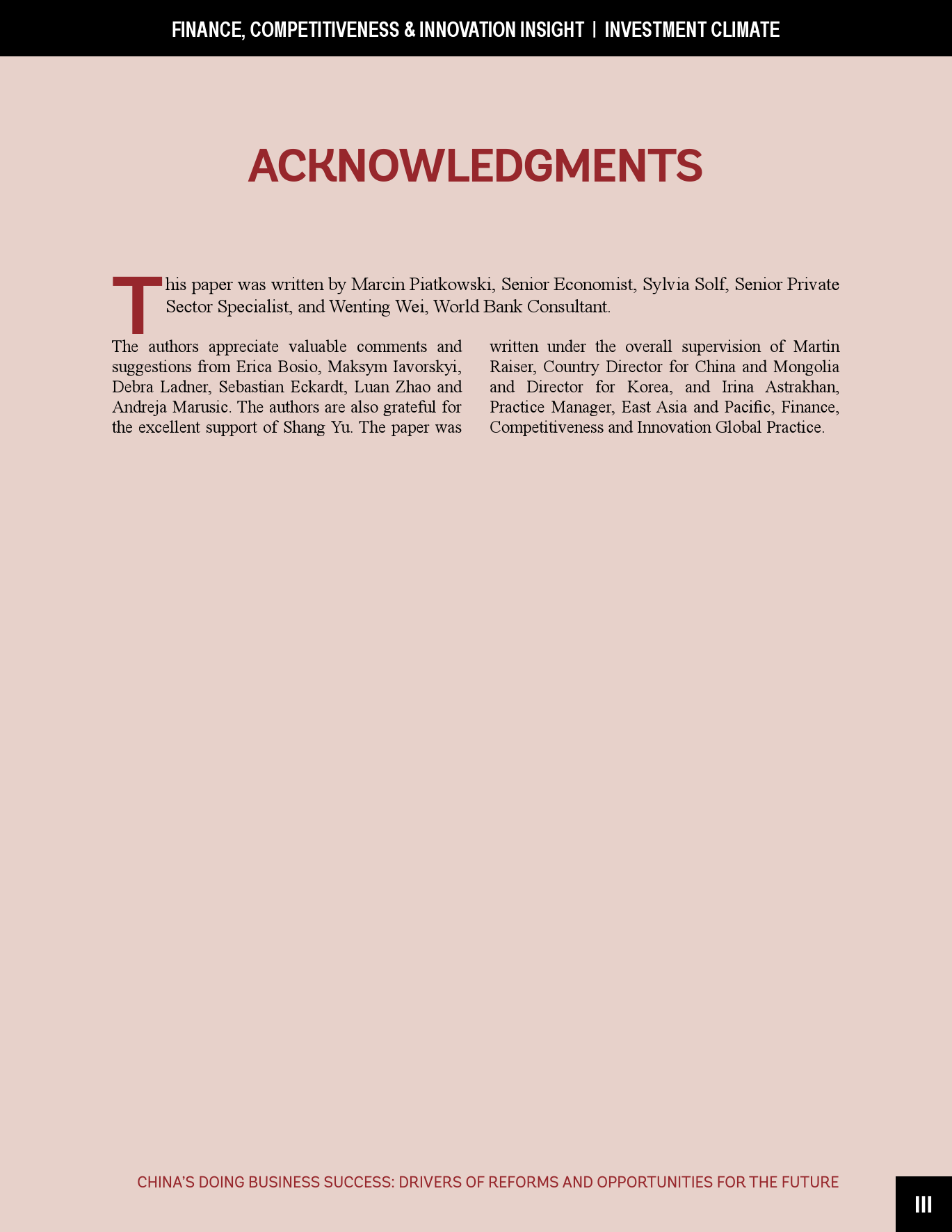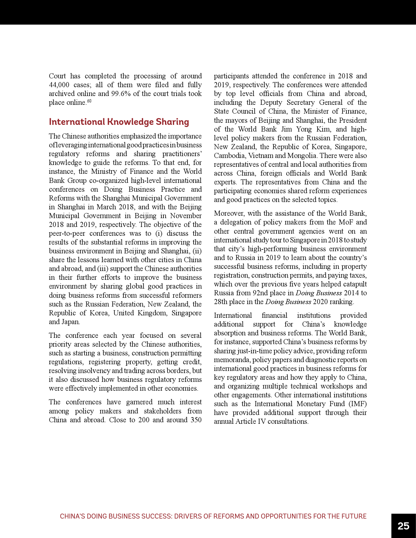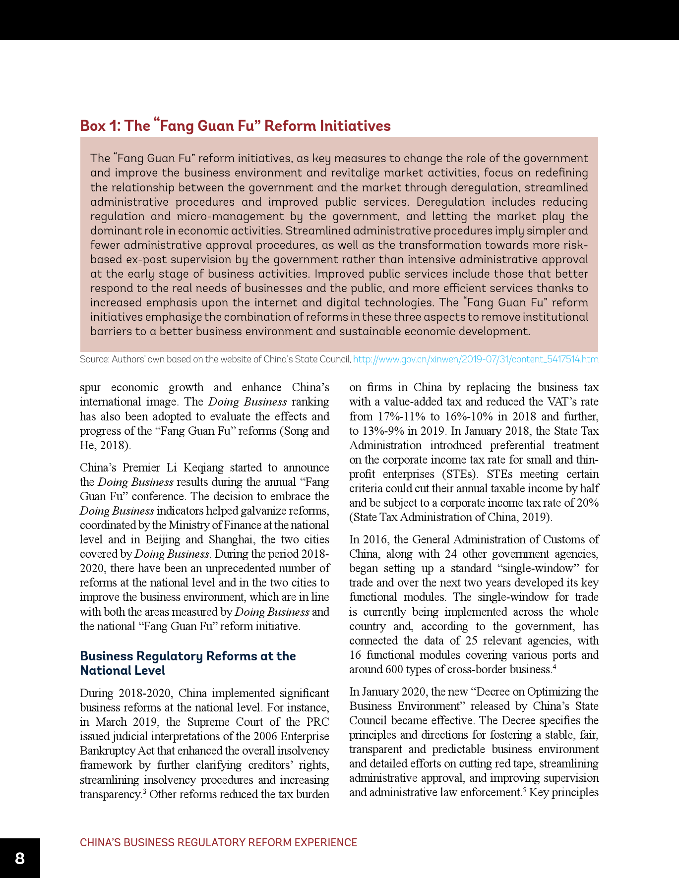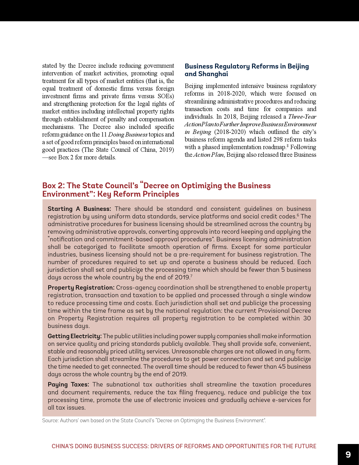- 虽然近年来取得了成功,但仍需进一步努力使中国的营商环境达到世界前沿,包括在《营商环境报告》评估的领域以及超出其范围的其它领域。